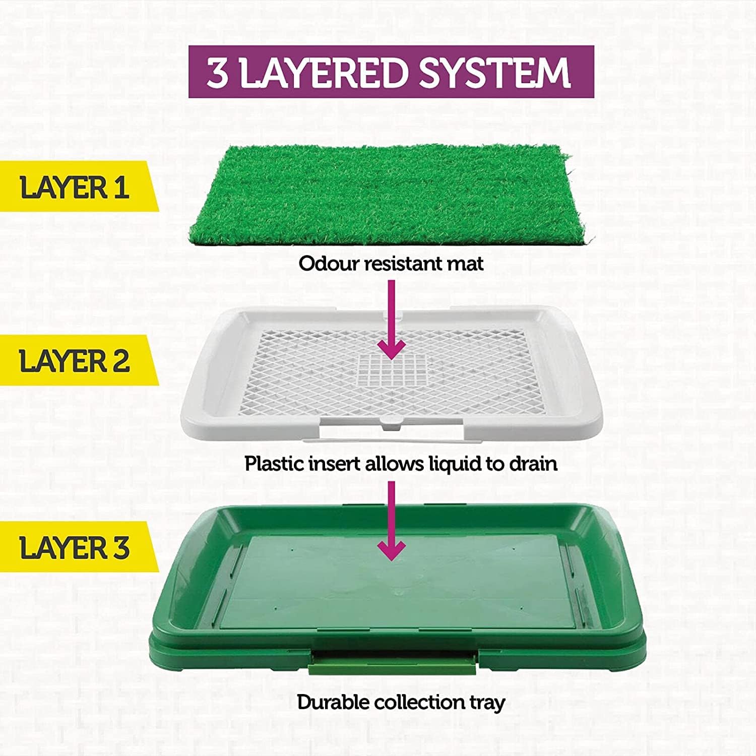 - THREE LAYER SYSTEM: This pet pad encompasses a three-layer system that makes clean up effortless. The mat sits on top of the plastic insert that locks in and allows liquid to drain into the durable collection tray.