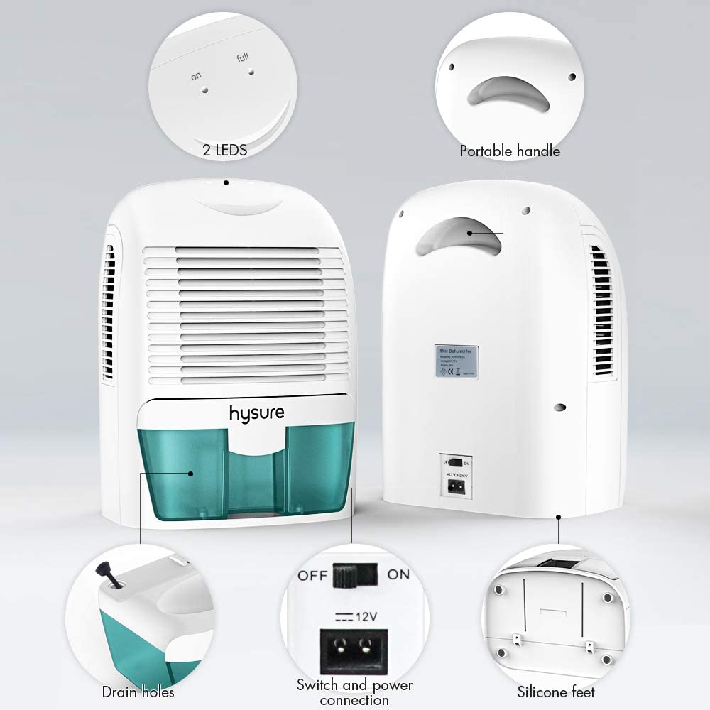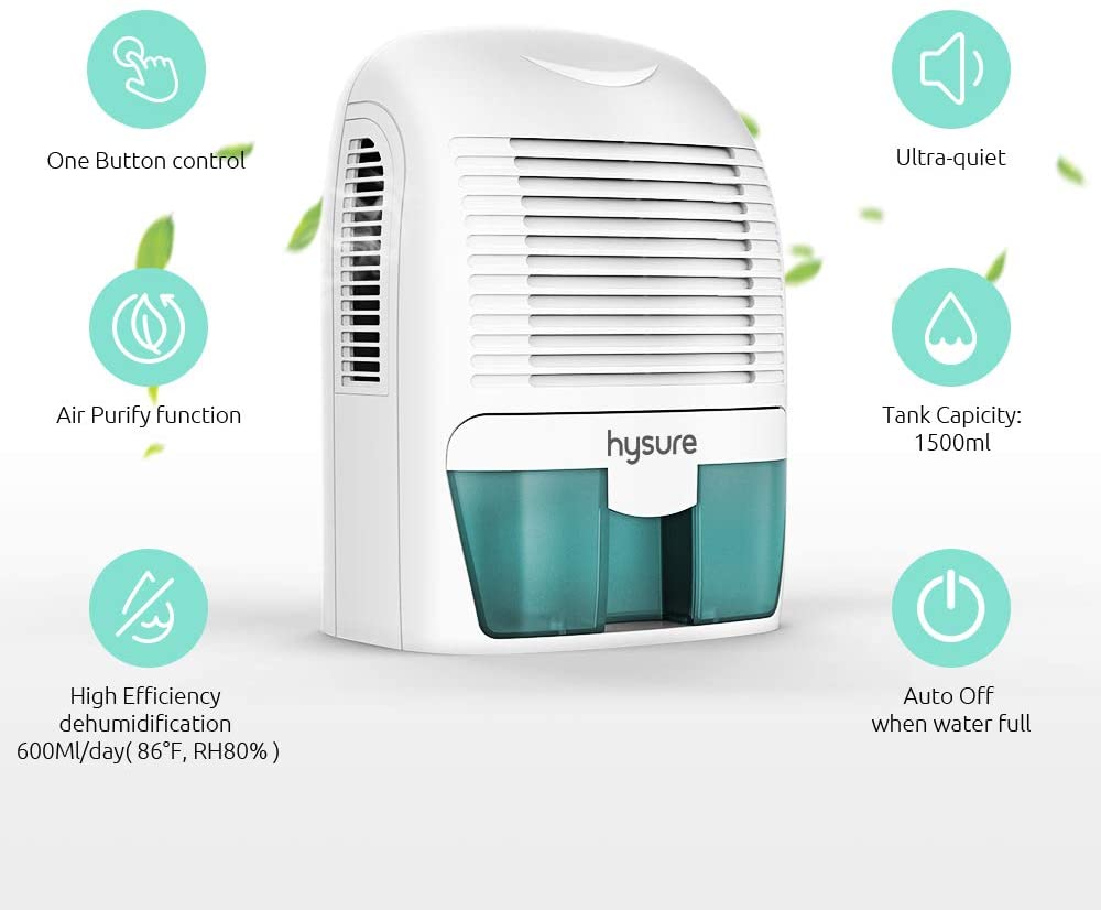 Designed with innovative whisper-quiet Peltier technology, with no compressor or moving parts, the hysure Dehumidifier with 1500ml water tank is compact in size but big on functionality. The dehumidifiers efficiently and hygienically extracts up to 550ml(18 fl.oz) of water per day at 86°F (30°C) 80%RH relative humidity. It is perfect for small areas up to 15-25 square meters including bathrooms, bedrooms, kitchens, closets, small laundry rooms, basements where dampness and humidity are a problem.