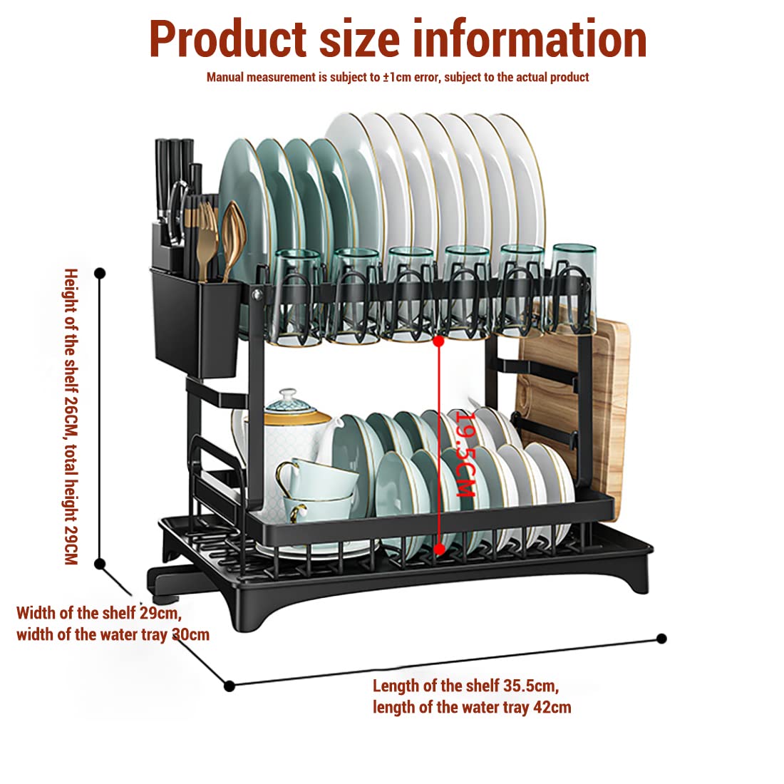- 2 Tier large capacity: Set includes 2 main dish rack(top rack with cup holder),1 chopping board rack, 1 knife rack,1 chopsticks holder, 1 drainer with a drainer tray( Note that the cup holder fits standard sized cups, larger cups may not fit)