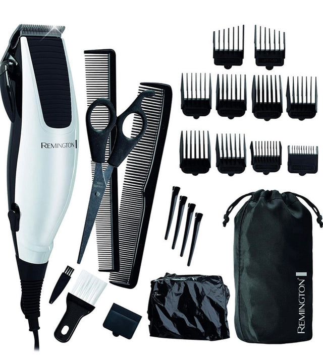 The Remington High Precision Haircut Kit features 24 pieces, making maintaining various hair lengths and trimming around the ears as easy as ever. Featuring a premium chrome finish and stainless steel blades that self-sharpen and never need oiling. Left and right ear trimming guides.