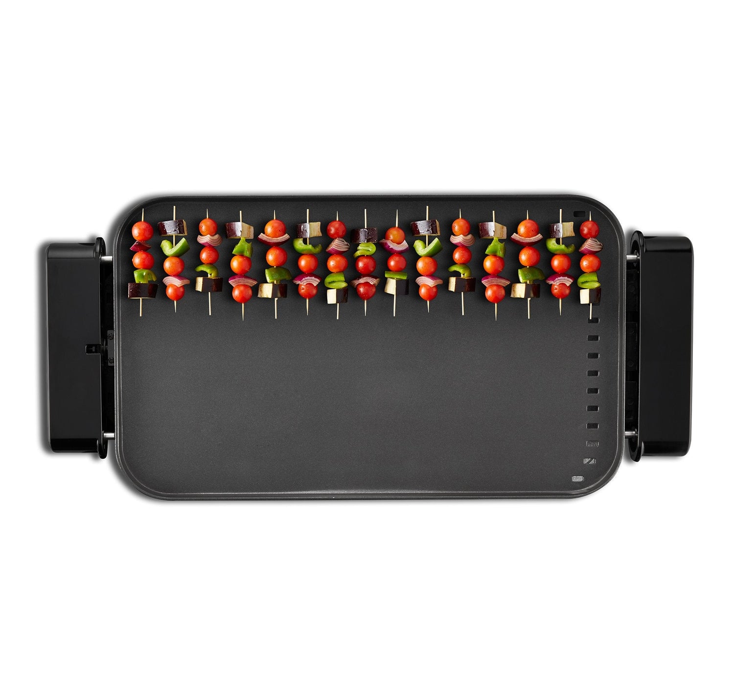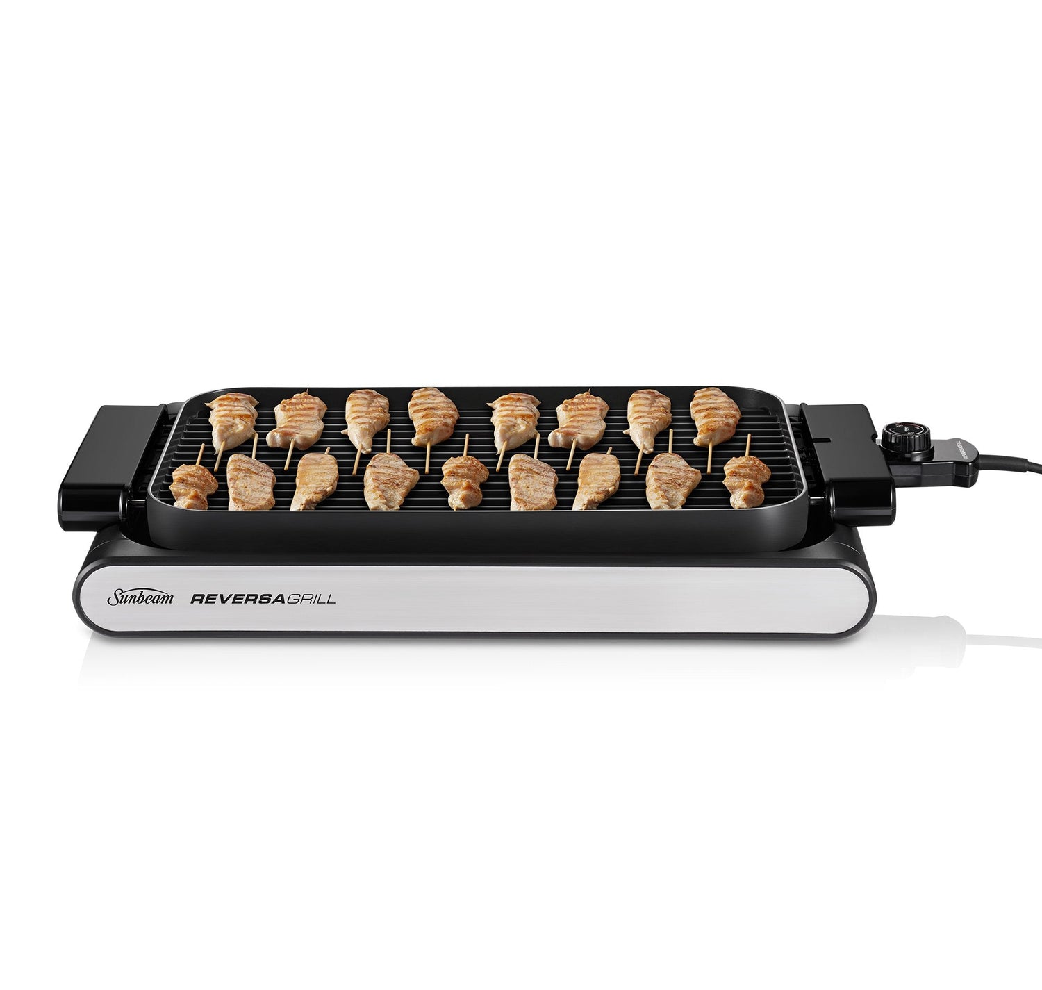 - This indoor/outdoor BBQ grill is the perfect entertainer. Use the ribbed plate for grilling meat or reverse it for a flat plate for eggs, mushrooms or breakfast hash browns
