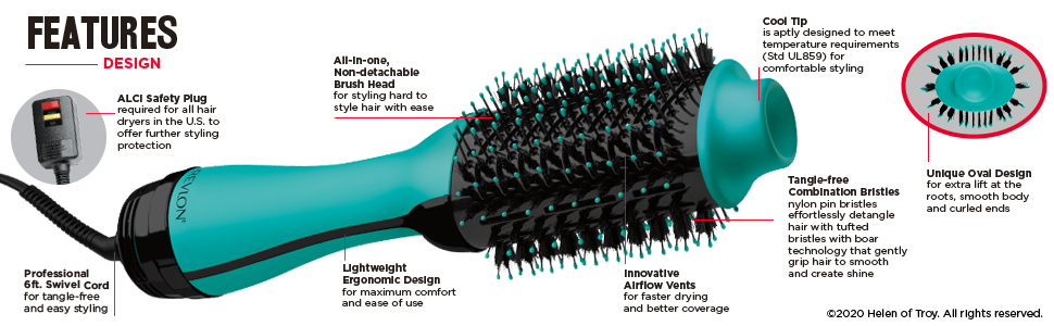 - IONIC + CERAMIC TECHNOLOGY: Unique Non-Detachable Oval Brush Design for Smoothing the Hair, while the round edges create volume