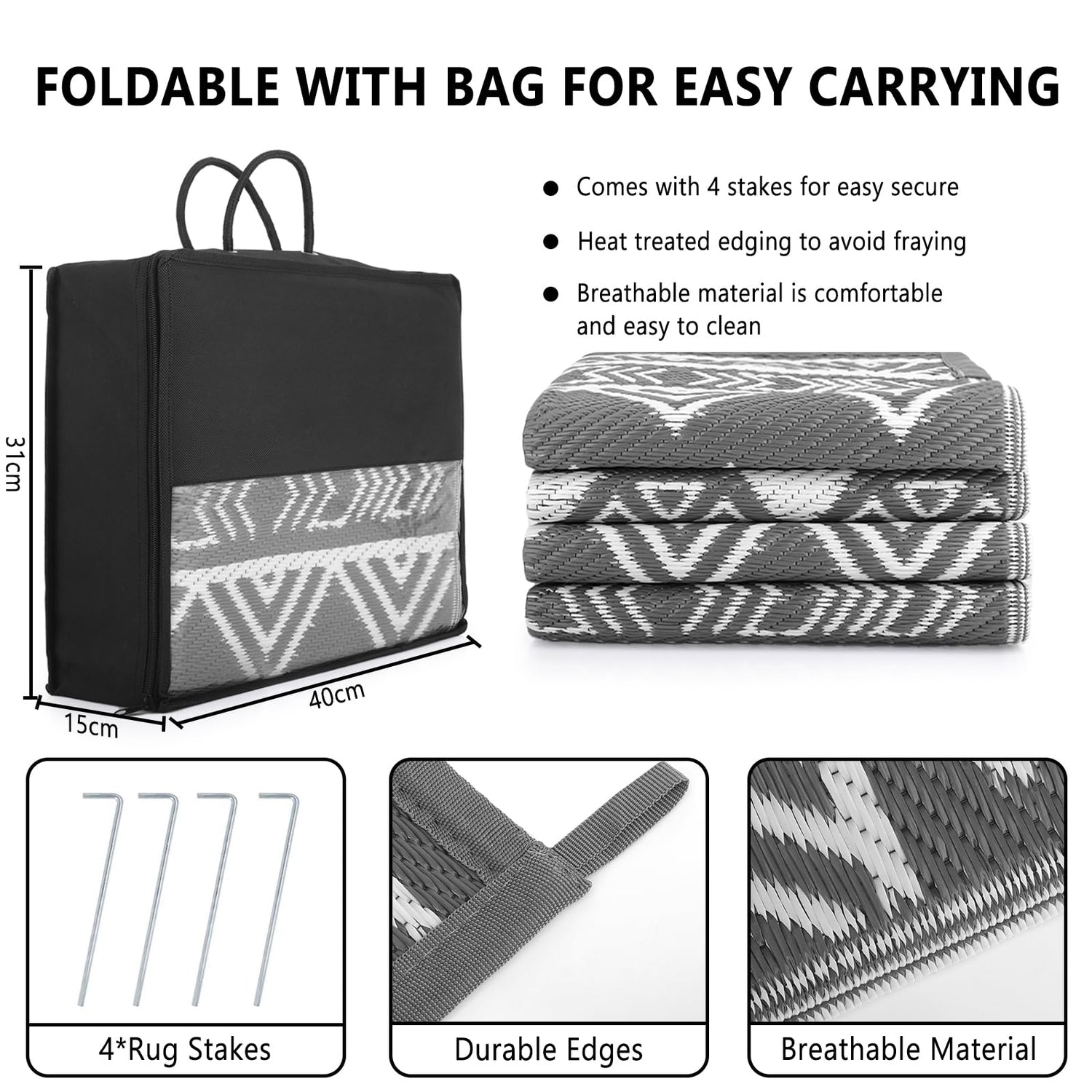 - WATERPROOF & EASY TO CLEAN: This indoor outdoor carpet is waterproof and the polypropylene plastic material makes it easy to clean. It can be used as a camping rug, you don't have to worry about spills, sand and dust when having a picnic, just rinse it with a hose or wipe it with a damp cloth. In addition, its breathable material can be air-dried in minutes.
