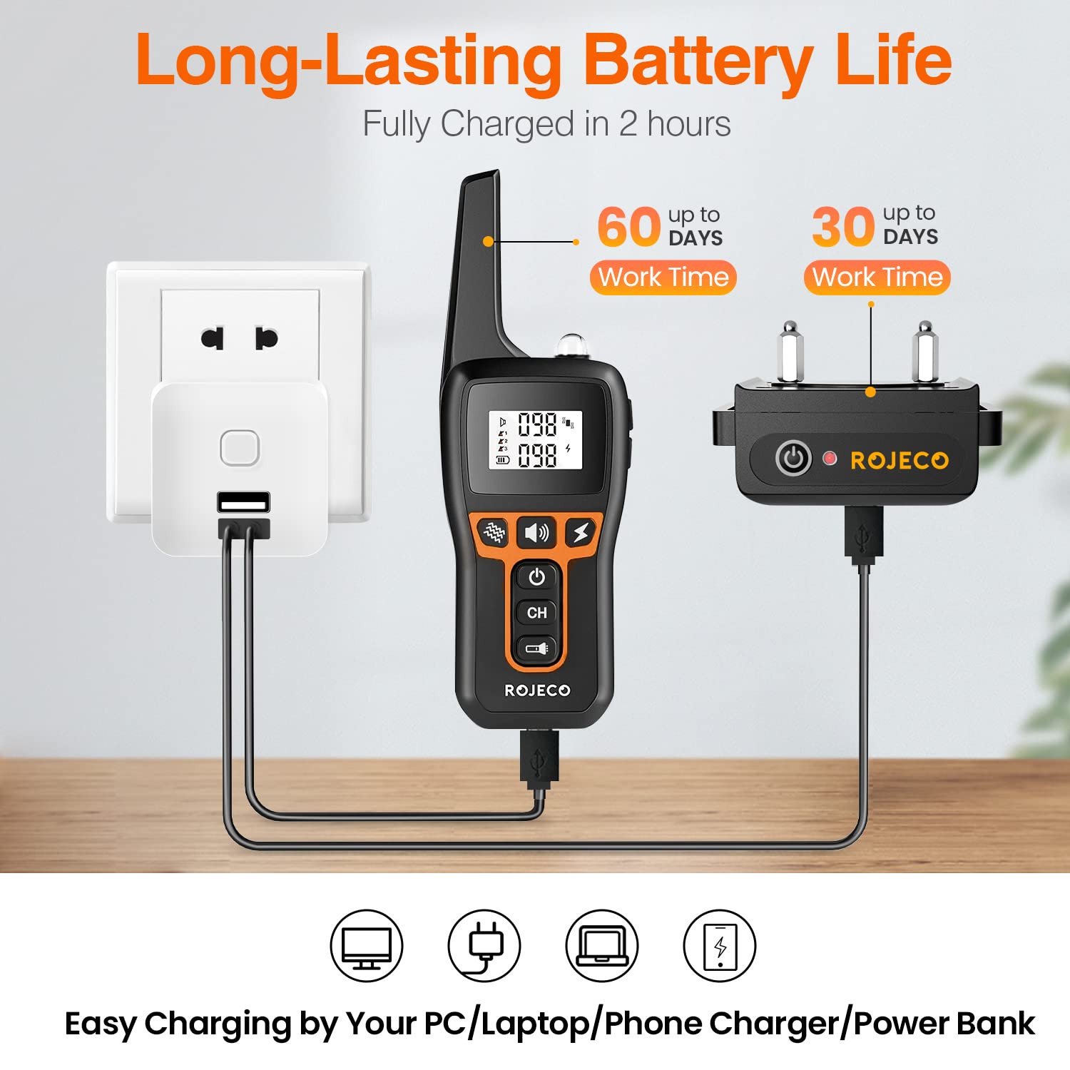 • USB Recharged Battery & Long Standby Time: Both bark collar and remote can be fully charged in 2 hours. The max battery capacity of the receiver is 650 mAh and can work for 30 days. The max battery capacity of the remote is 300mAh and can work for 60 days