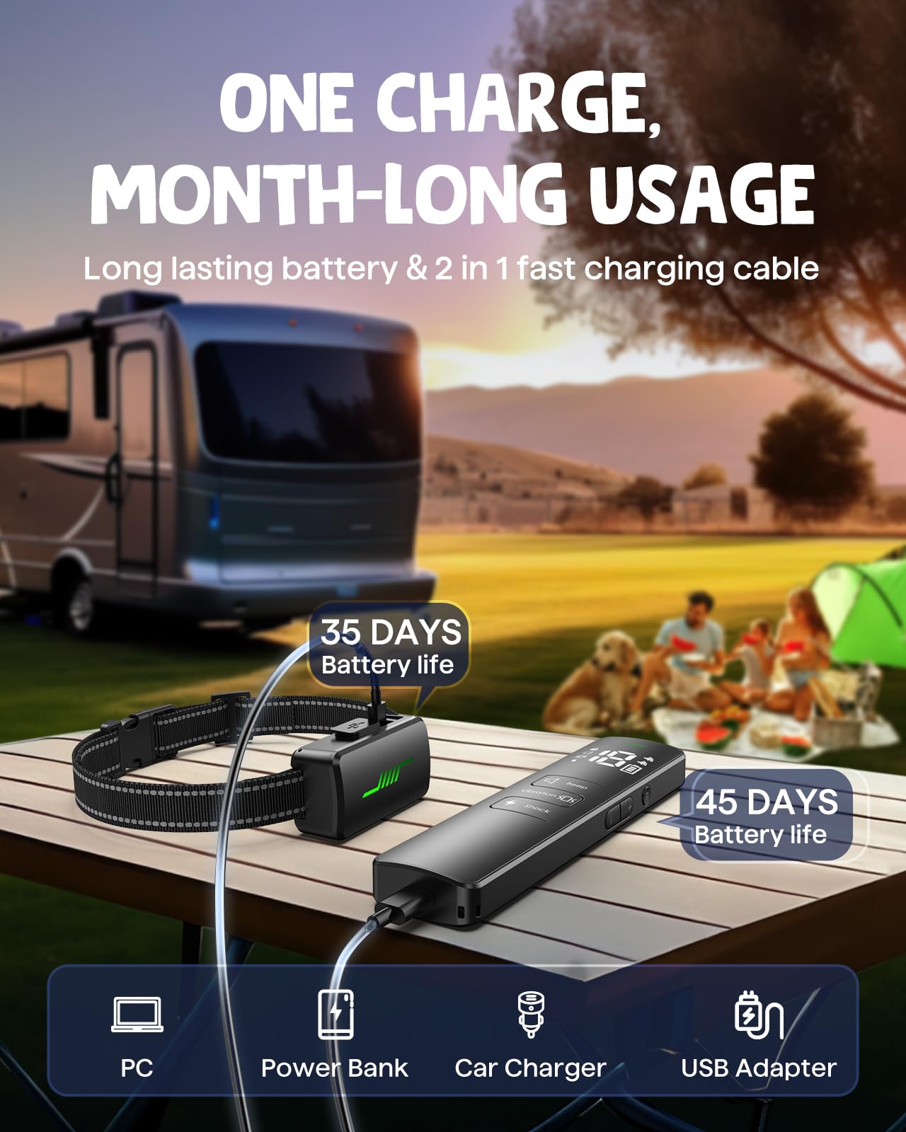 - The remote of our electric dog shock collar offers an impressive standby time of 45 days and the shock collar up to 35 days on a single charge. No more searching for a specific charger—our upgraded e-dog shock collar can be conveniently and fast-charged in just 1.5-2 hours using any power bank, wall socket, car socket, etc. (Note: do not charge with an adapter greater than 5V/1A)