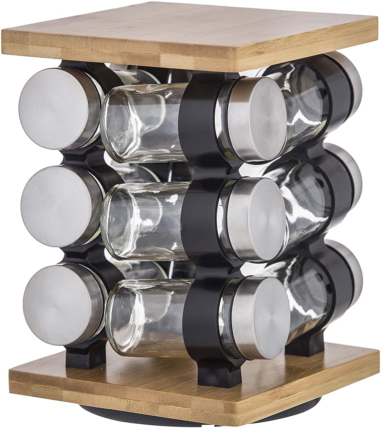 Stores up to 12 jars to hold dried herbs and spices. Rack rotates on a lazy susan base to make viewing and retrieving quick and easy. Jars come empty. Constructed from bamboo/glass/stainless steel and ABS. Jars: hand wash only. Stand: wipe clean.