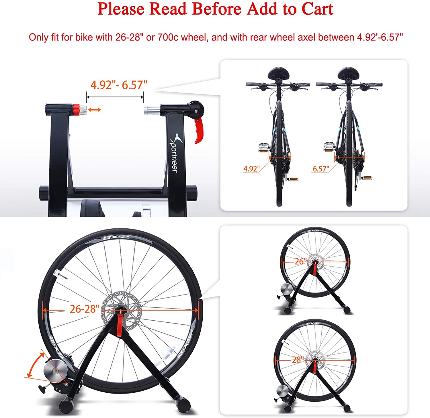 This Indoor Bike Trainer Stand fits any road or mountain bike with a 26-28" or 700c wheel, and with rear wheel axel between 4.92'-6.57"
