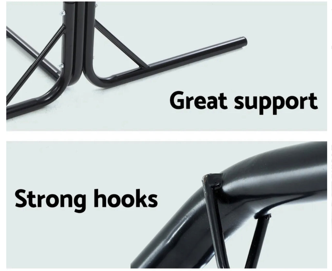 Need a heavy-duty stand for your hammock chair? Look no further than the Gardeon Full-frame Hammock Chair Stand. One of our popular models, the full-frame stand remains a firm favourite with customers who love to have their hammock chairs indoors or outdoors. Crafted from powder-coated steel, the 1.6m frame is designed to be weather-resistant and rust-resistant and strong enough to withstand robust use of up to 200kg weight capacity. Simply hook up your single or 2-seater hammock chair to the reinforced S-hook, adjust the desired height and you are ready for a relaxing time in the chair in the backyard, at the balcony, by the poolside or simply in your living room. Not least, the wide base ensures that the entire ensemble is safe and sturdy for many years of wonderful relaxation and leisure with your hammock chair.