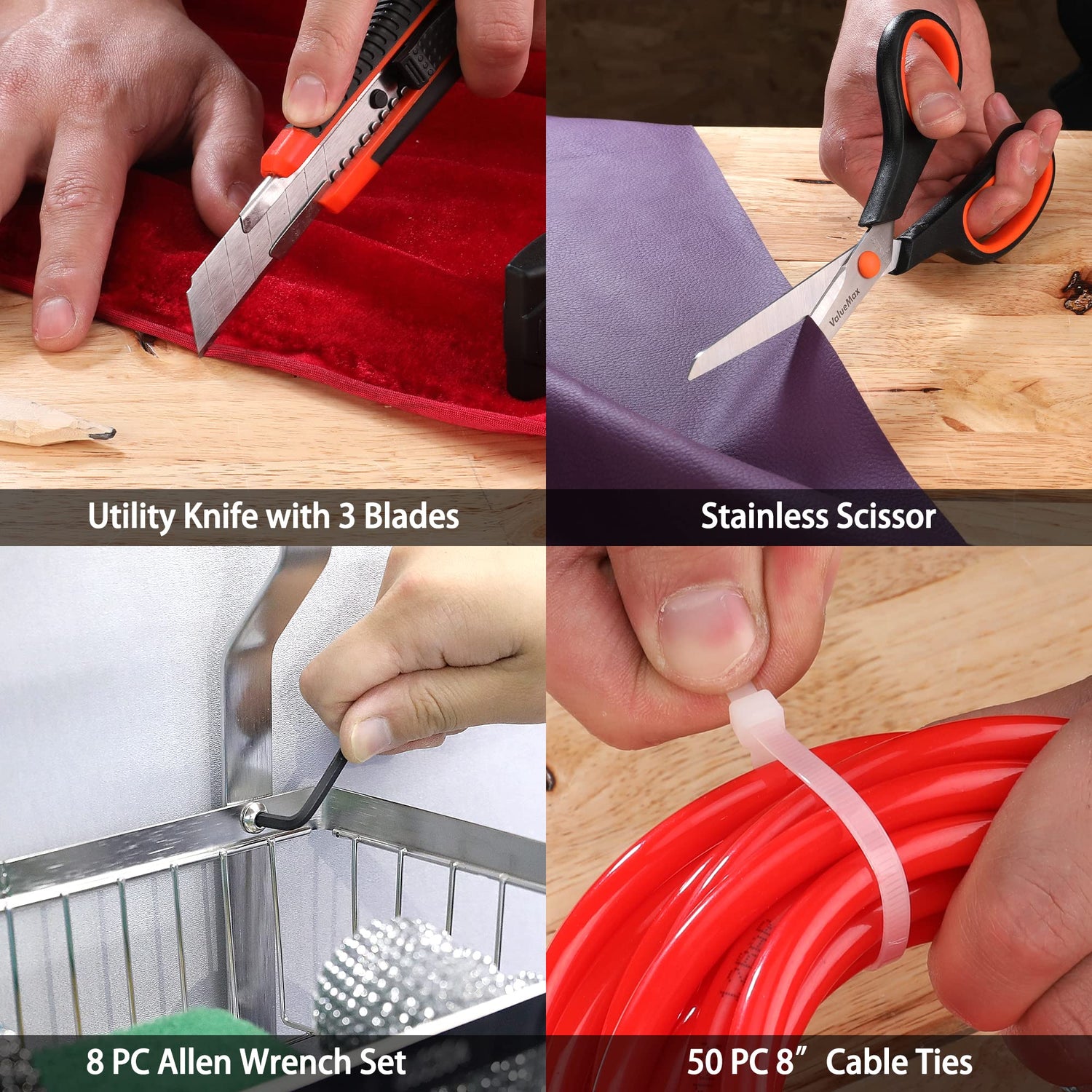 - BASIC TOOL KIT: Contains almost every necessary hand tool you need for work and DIY projects around the house, garage, or office. The toolset includes a pliers set and adjustable wrench, screwdrivers, magnetic holder and bits, utility knife, saw, hammer, tape measure, torpedo level, hex key, cable ties, ratchet wrench with sockets, and other hardware accessories