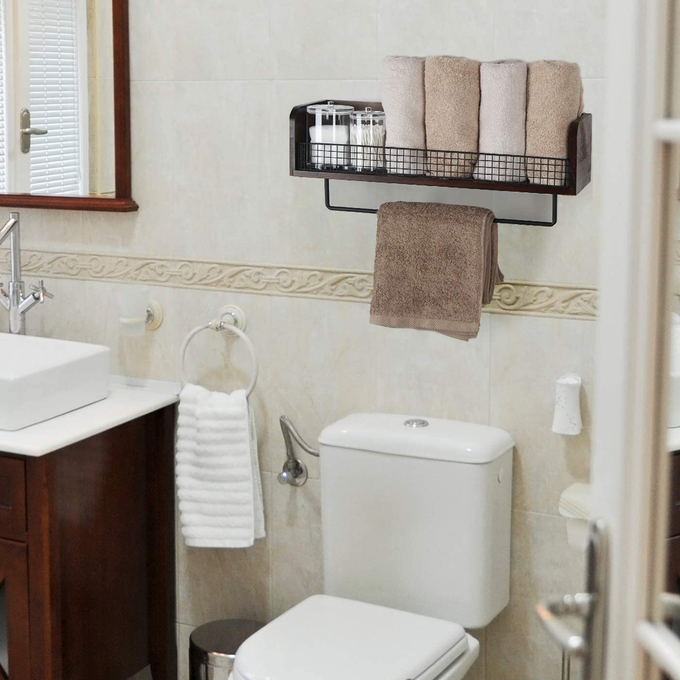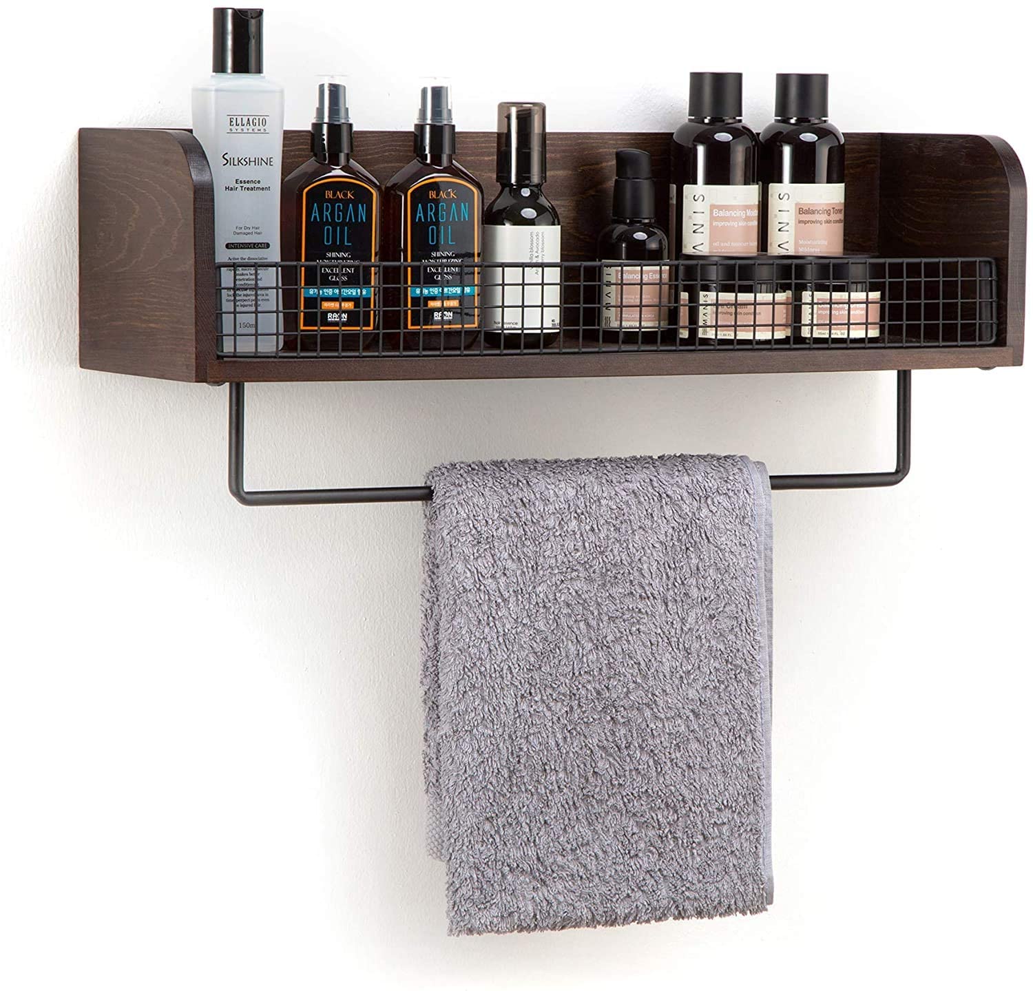 Wood and Metal Wall Mount Floating Kitchen Spice Rack Shelf with Towel Bar
