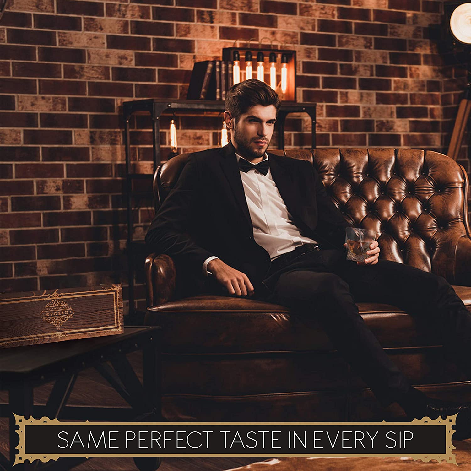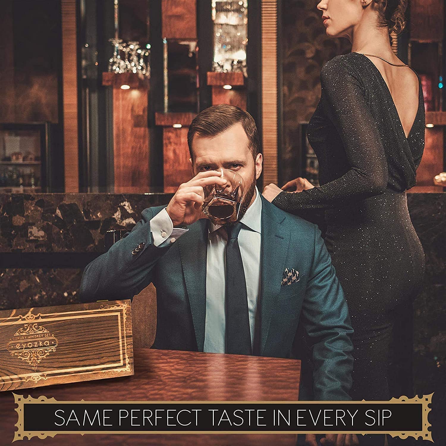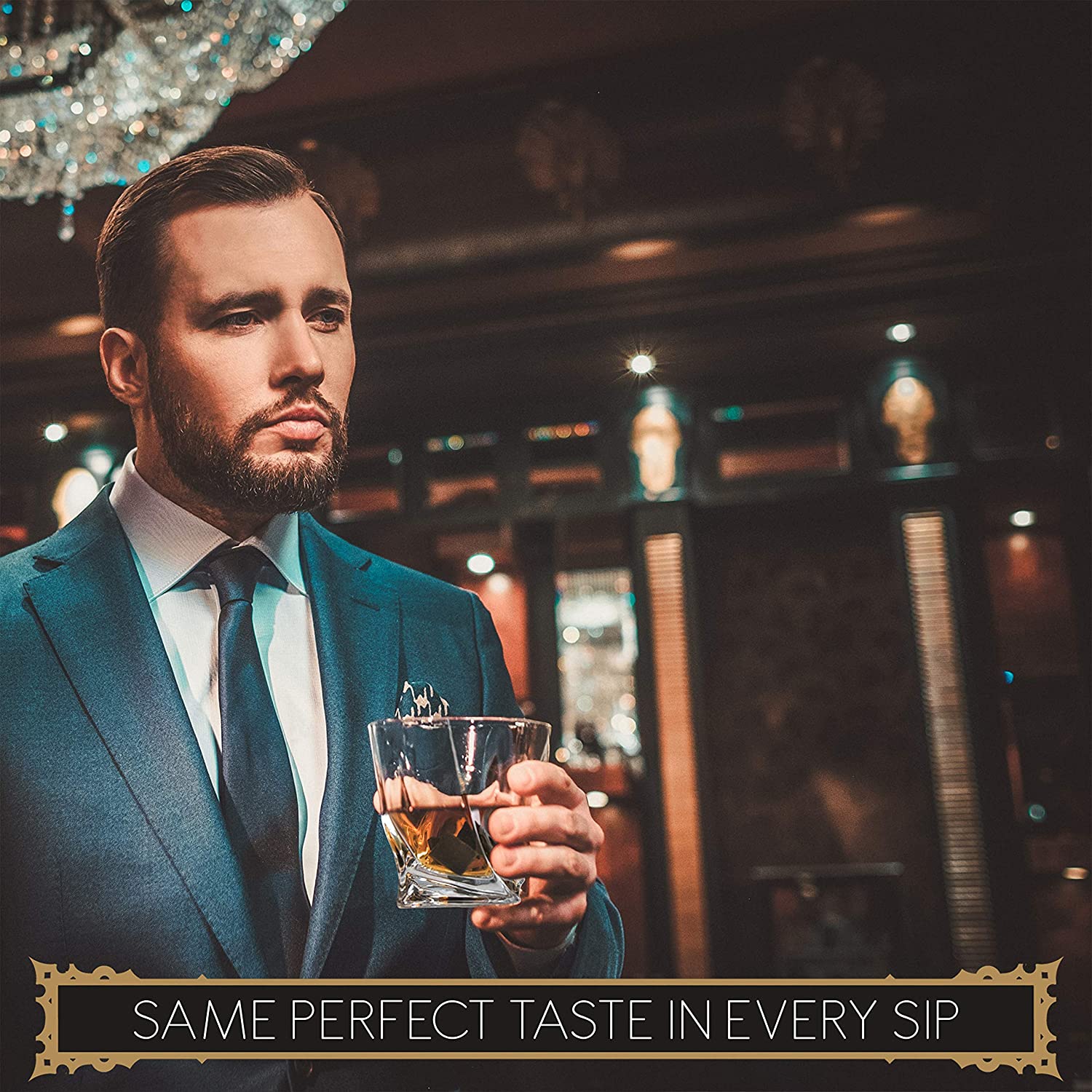 • SAME PERFECT TASTE IN EVERY SIP - Thanks to our whiskey glass set, each sip will taste the same and stay away from being diluted by ice in your new crystal glasses. Goodbye to problem of watering down your whisky! Your best alternative if you're looking for unique Christmas gifts.