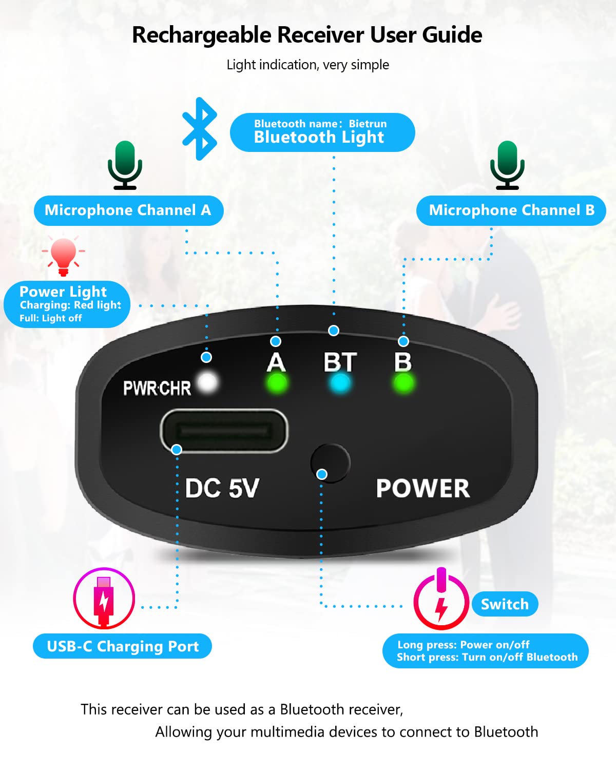 - 1-Year Warranty And Precautions: If your microphone has no sound, make sure you have enough power for the microphone and receiver. Insert the MIC jack, Not an AUX jack. Bietrun offers1year warranty and free replacement service.Can write to us when you have any questions.We will be the greatest brand in the United States.Not supported Bluetooth speaker and MacBooks.