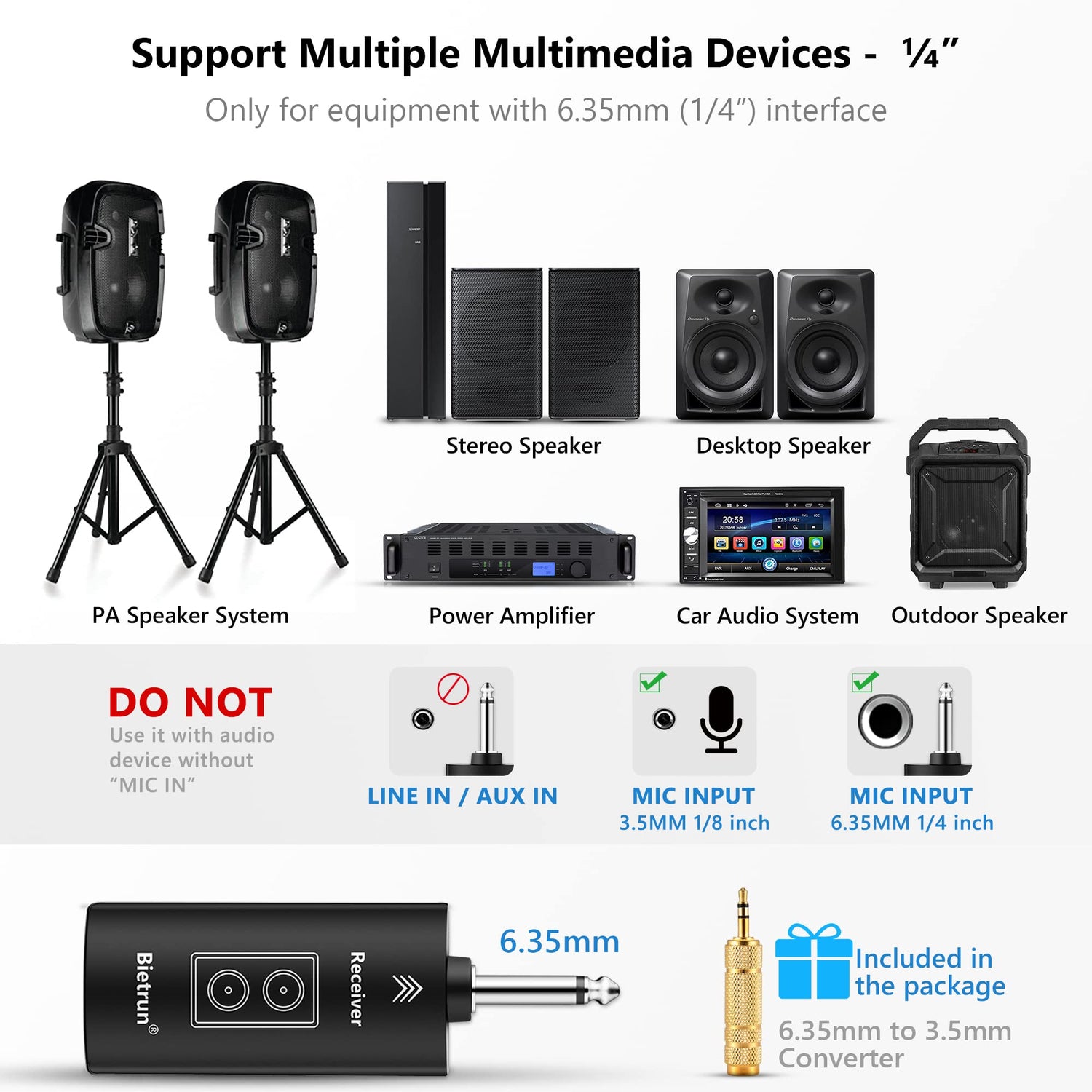 - Plug And Play Microphone: No need pair. Only for input devices with 6.35mm (1/4") or 3.5mm (1/8") MIC interface, E.g speaker, Singing machine, audio amplifier, PA system, Voice amplifier, truck speaker system, Dome speaker system etc.Rechargeable Bluetooth receiver, which can be connected to smart phone to karaoke on the speaker. Or as a Bluetooth receiver to play music on old speakers.Turn on the receiver, search for the Bluetooth name: Bietrun, Play your music for karaoke.