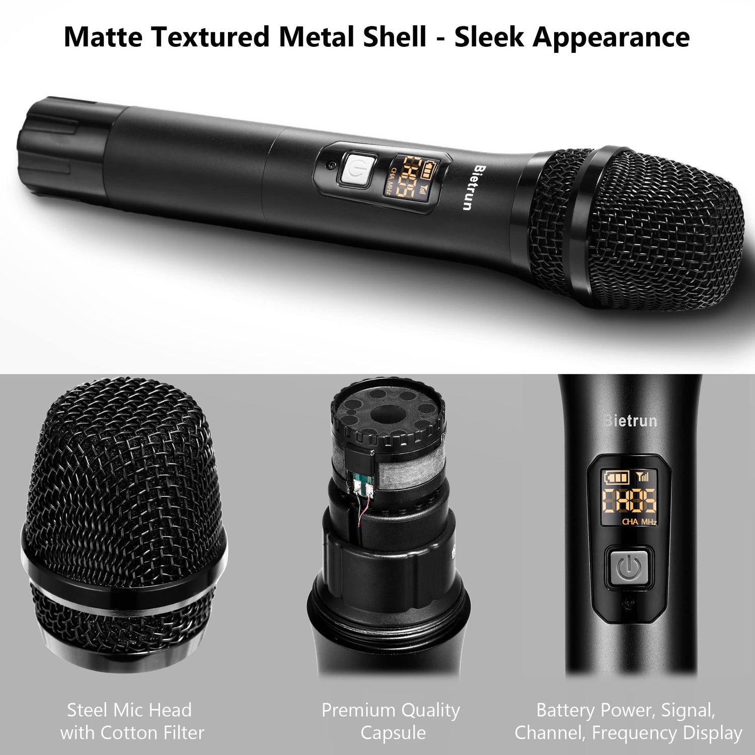 - Wireless Microphone with Bluetooth Receiver: Built-in high sensitivity professional Dynamic Unidirectional microphone core, transmission distance upgrade to 160 feet (Open place), Bluetooth 32 feet. Enhance Signal stability, No delay, No radiation, Anti-howling, Anti-jamming, Constant frequency. The mic outer case is alloy material which is harder, lighter and more wear-resistant.(Not compatible with TV).
