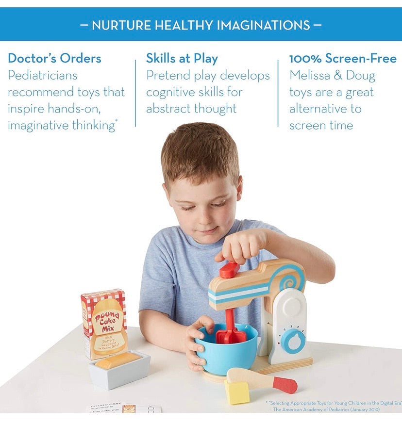Mix up some delicious pretend-play fun with this realistic wooden mixer. Turn dials to "adjust speed" and use the crank to turn the bowl that fits the mixer. Wooden ingredients include two pats of Butter and a two-part egg, both of which have self stick tabs that can be sliced through with the child-friendly wooden knife. Follow the directions on the recipe card to make pound cake—the set includes a pound cake mix box, pretend pound cake loaf, and a cake Pan. Kids three and older will love cracking, slicing, blending, and serving up pretend baked treats with this set that encourages creative thinking and imaginative play and promotes memory and number skills.