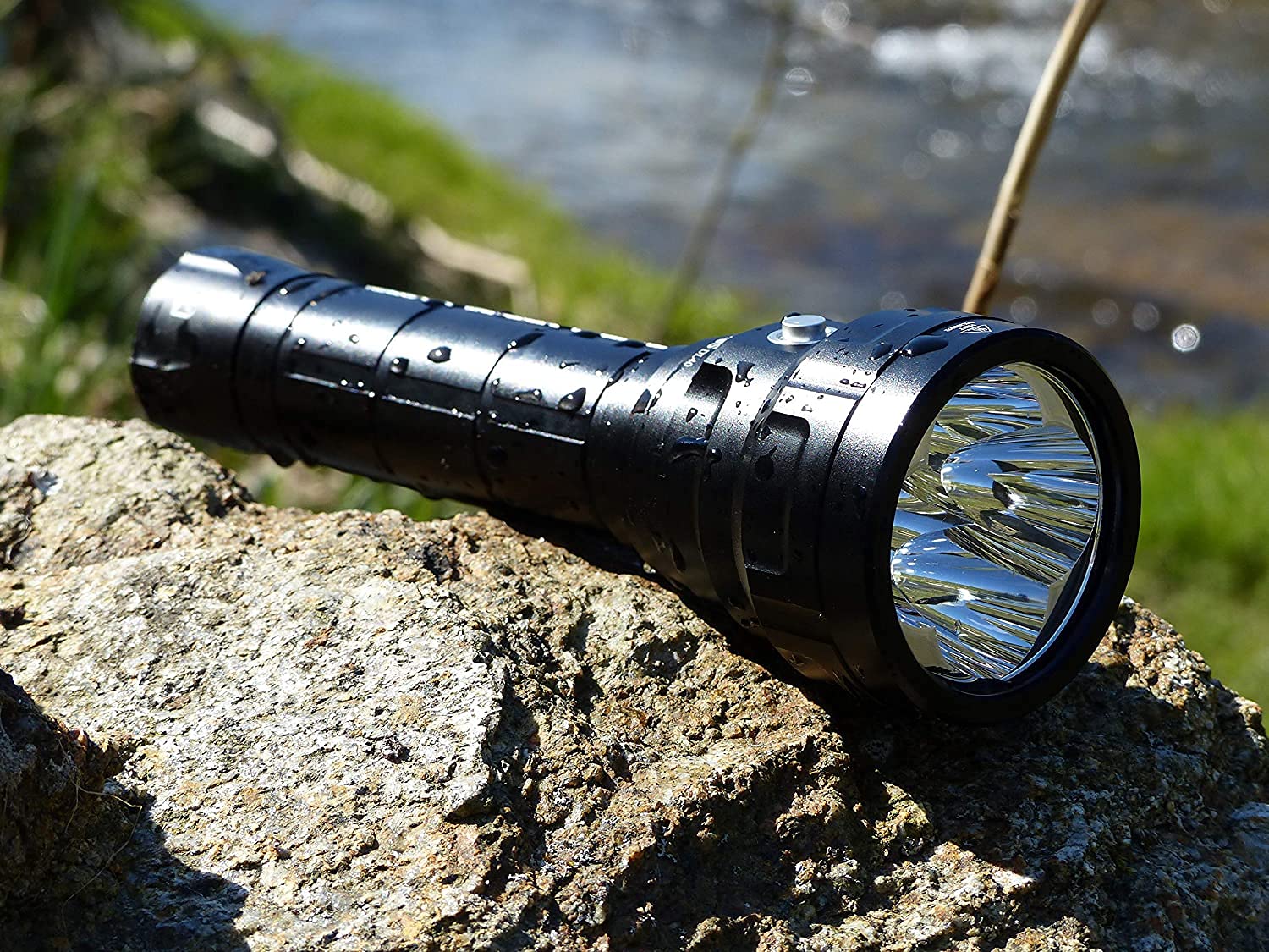- IPX8 Waterproof Grade: This scuba diving flashlight is equipped with extra 2 O-rings special sealing design, reach the IP68 waterproof level, available underwater 150 meters. A safety wrist lanyard could avoid flashlight fall when you are diving.