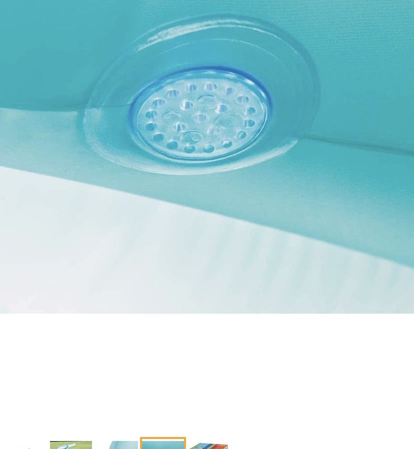 79" L x 77" W x 36" H (2.01m x 1.96m x 91cm) inflated. 11ga (0.28mm) vinyl. • Sprayer spout attaches to garden hose. Capacity 7" (18cm) of wall height: 53 gal (200L). Drain plug & repair patch included.