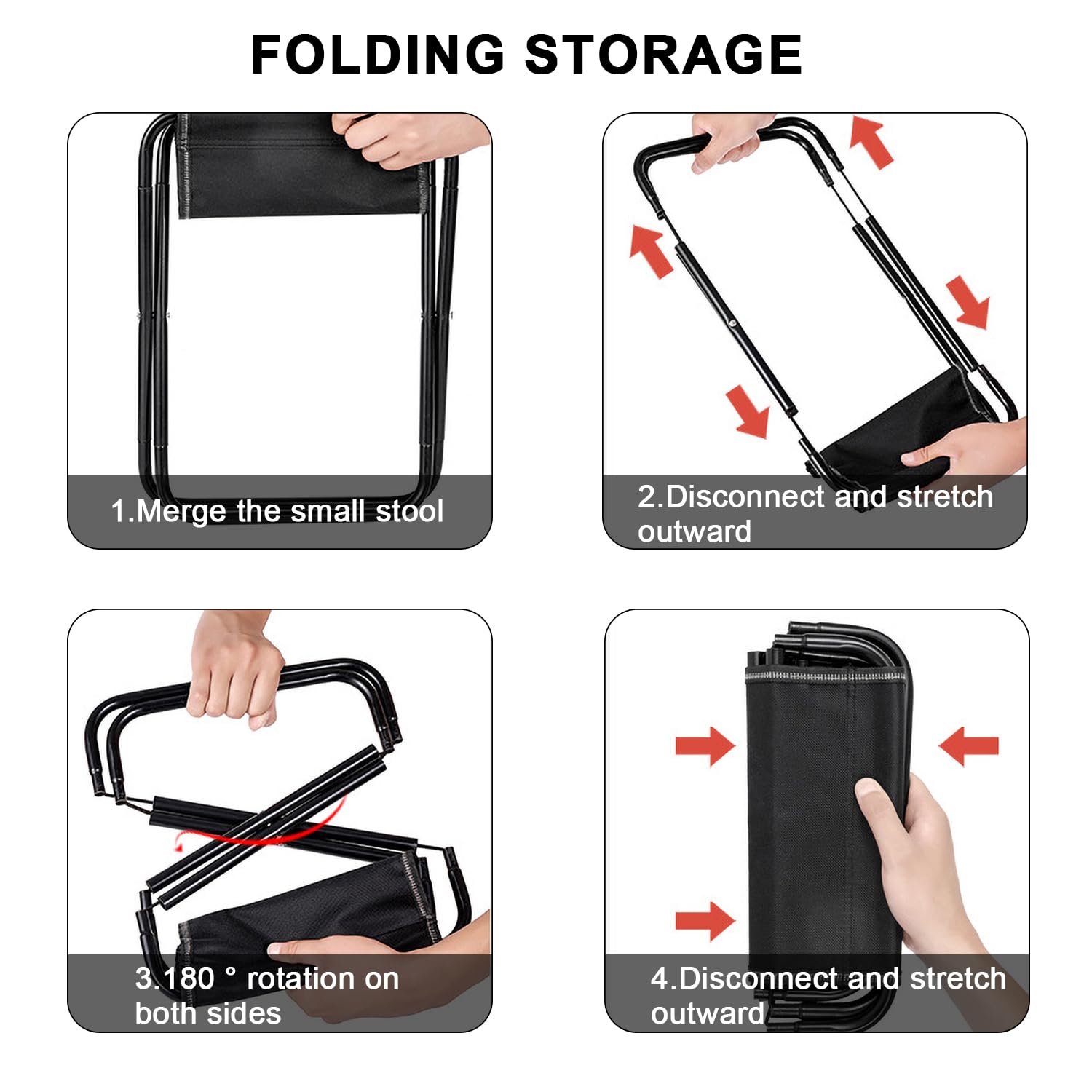 - Portable camping stool, unfolded size: 11.8 "L x 11.8 "W x 12.2 "H; folded size: 3.9 "L x 11.8 "W, can save a lot of space. It is just a small portable stool. With a maximum weight capacity of 100 kg (220 lbs), it can accommodate most adults.