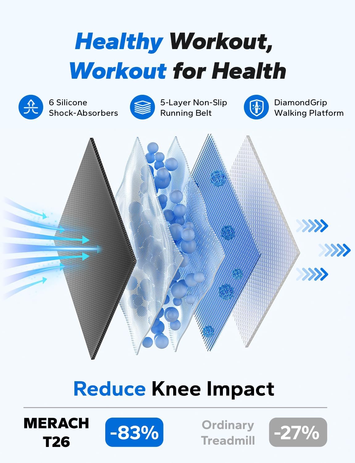 - Premium Anti-Slip Diamond-Tread Walking Platform: Engineered walking pad treadmills for home, the Walking Pad features a slip-resistant diamond pattern that delivers superior grip and stability. 5-layer cushioned belt works with 6 silicone shock absorbers and dual rubber cushioning to create gentle joint protection - keeping your knees comfortable while maintaining natural movement. Enjoy responsive shock absorption and cloud-like comfort underfoot, whether you're hitting daily step goals.