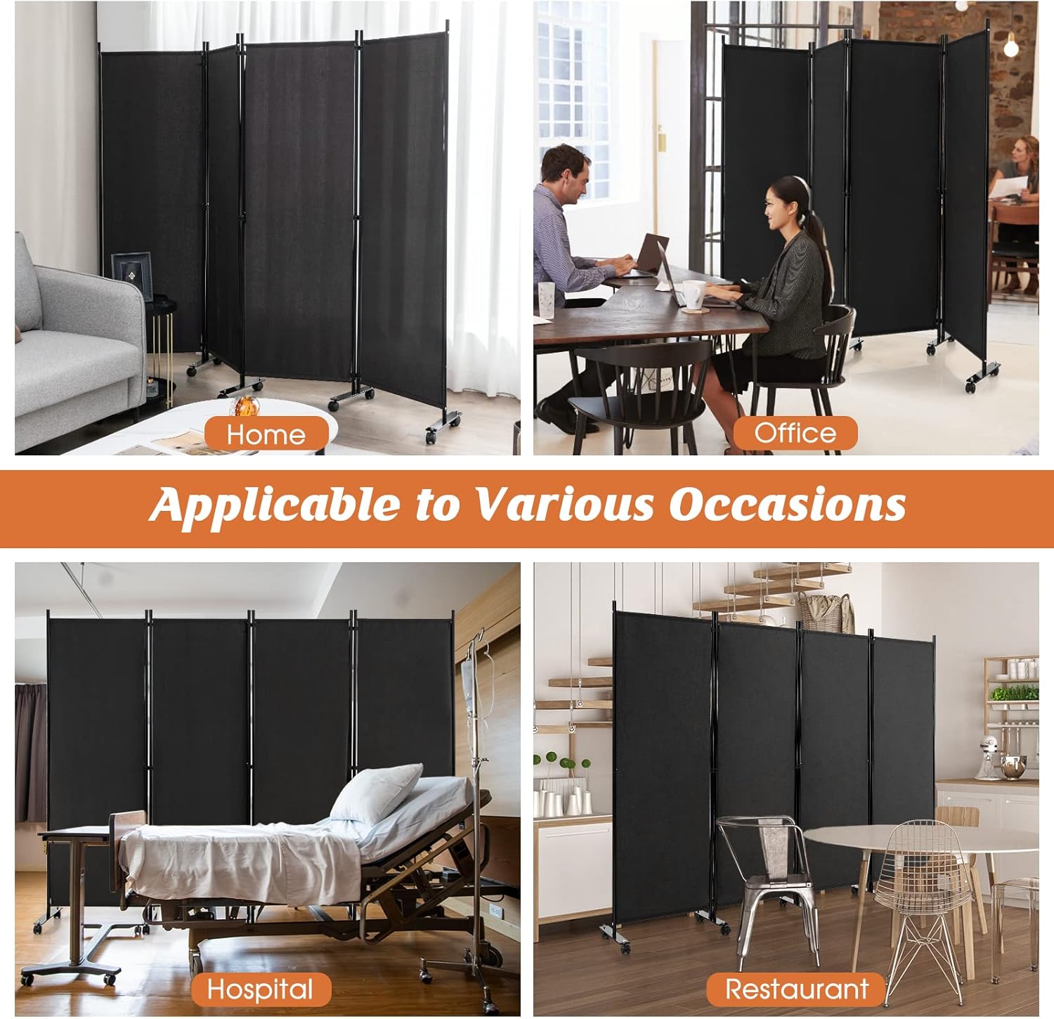 4-Panel Folding Room Divider, 1.73m Rolling Privacy Screen with Lockable Wheels, Portable Wall Divider and Separator, Freestanding Privacy Protection for Living Room, Bedroom, Office