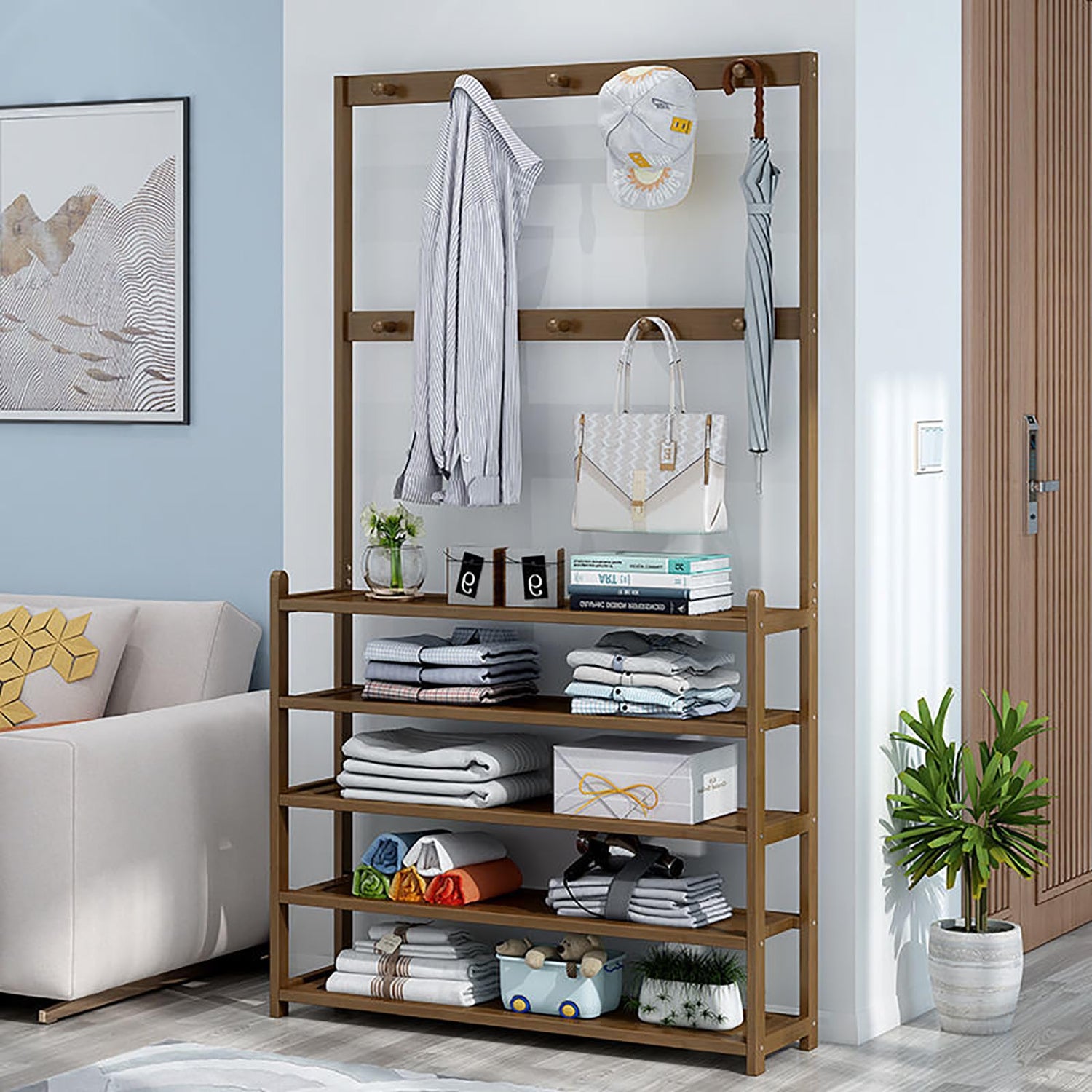 - Versatile and Convenient: Coat rack, shoe storage all in one, there are 10 hooks which you can hang garments/hats/scarfs/bags/umbrellas. Bottom is a 5 Tier Storage Shelf which can place shoes/towels/boxes. You can store more then 20 pairs of shoe, 5 varying-height shelves help you easily classify your different types of shoes. shelves give them steady support, even thin-heeled shoes