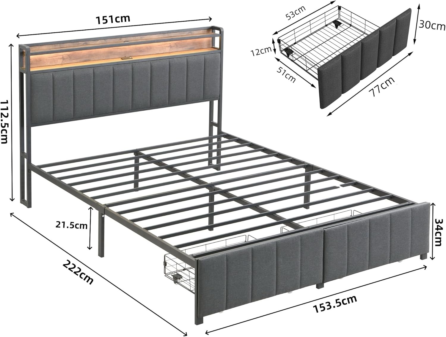 Bed Frame with Storage, Upholstered Bed Frame with LED Lights Headboard and 2 Drawers, Charging Station, Noise-Free, No Box Spring Needed, Easy Assembly, Grey - Queen is backordered and will ship as soon as it is back in stock.