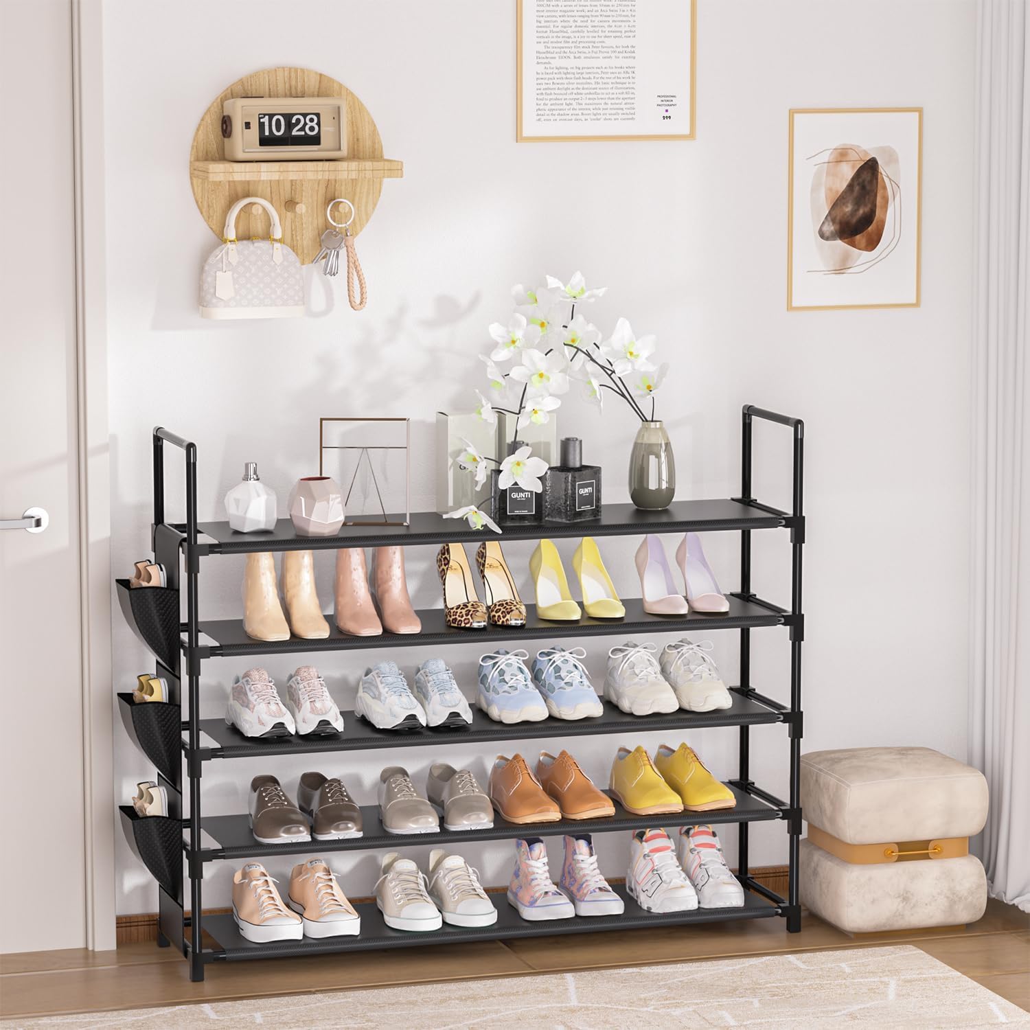 - Large capacity long shoe rack: This 5-tier shoe rack, black with a side bag, offers lots of storage room, 33.3" wide x 11.2" deep x 35.6" tall, and can hold 20- 25 pairs of shoes. A satisfying entryway shoe storage organiser for storing four- five pairs of shoes on each shelf.