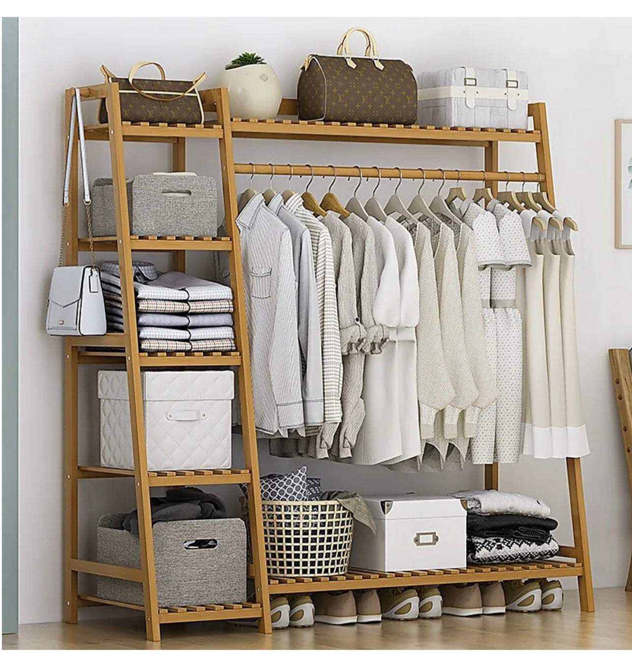 Create a fresh, natural look in your bedroom, entryway, or walk-in wardrobe with this eco-friendly bamboo clothing rack by Randy & Travis Machinery. With five tiers of storage, hooks, a hanging rod, and seven shelves, you'll have plenty of space to organise your entire clothing, accessories, and shoe collections. Crafted from solid natural bamboo, this clothing rack has an uncluttered, Nordic-inspired design that will accent your room's dƩcor. Done in a neutral finish, it will blend in well with the colour scheme in nearly every home.