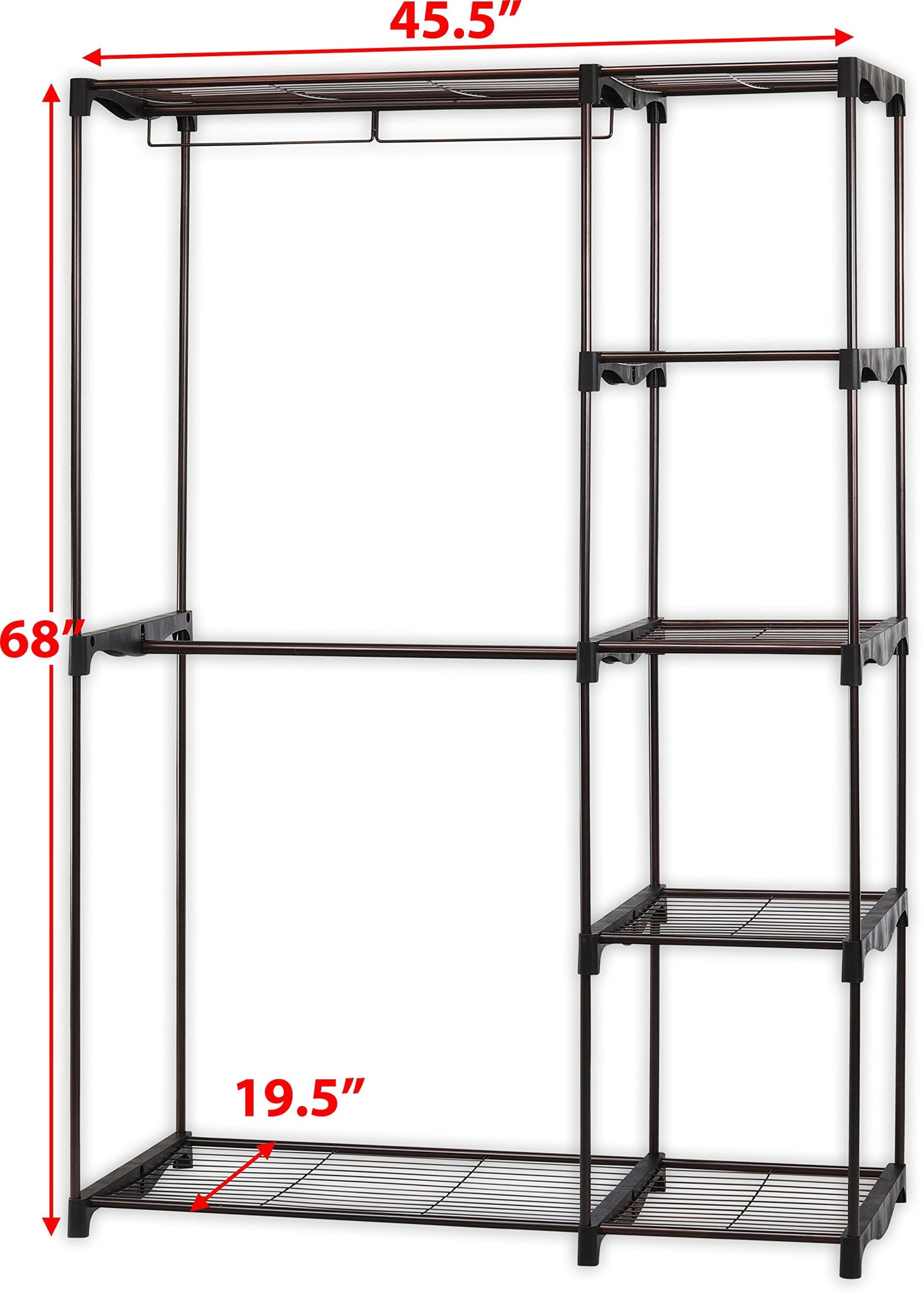 - 4 durable wired shelves that keep your clothing, shoes, boots, pants, and accessories organized. 2 sturdy hanging bars for your clothes, jackets, coats, and pants.