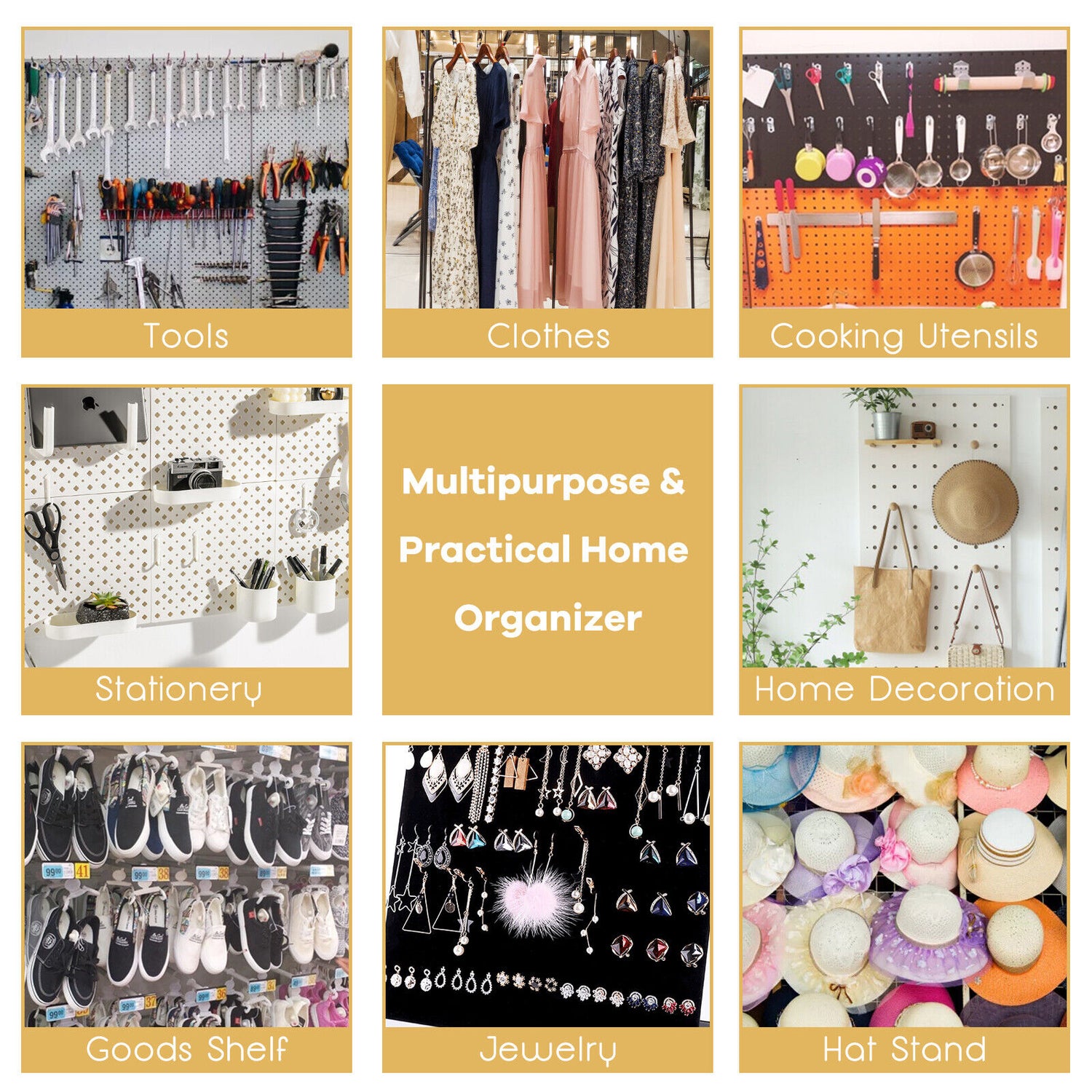 - Pegboard design to display your jewellery, clothes, hats, bags, tools, etc.
