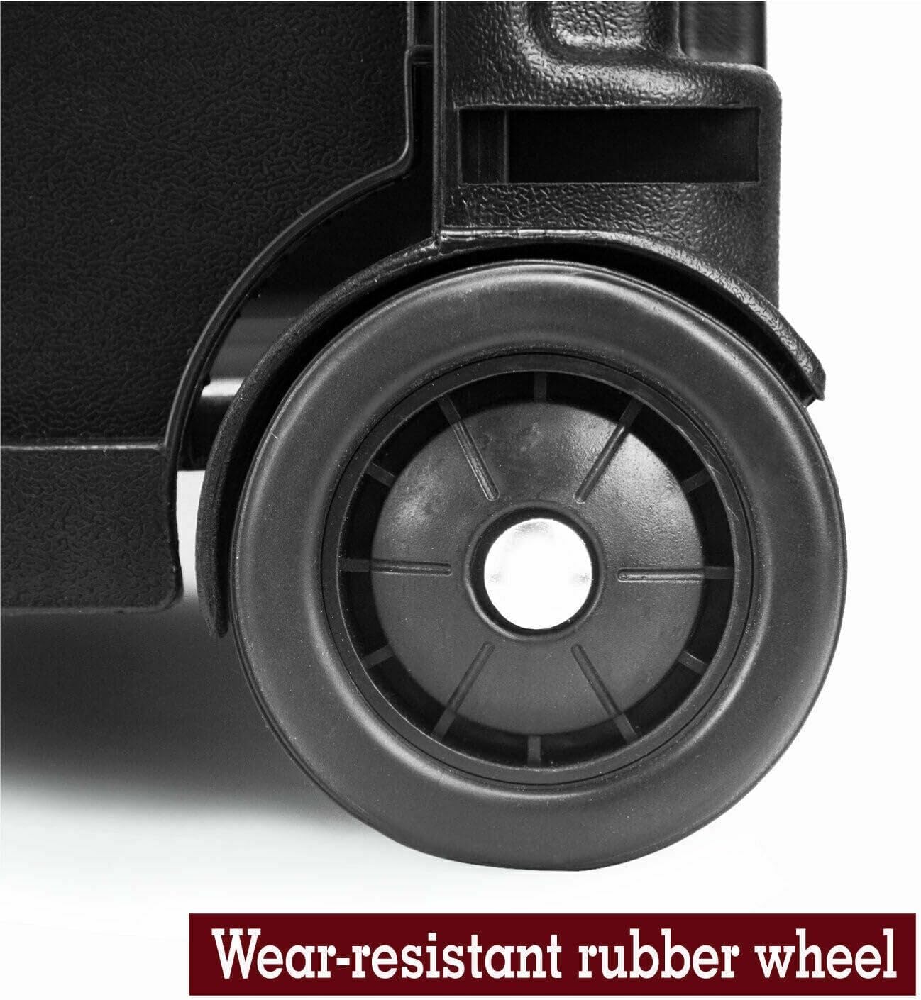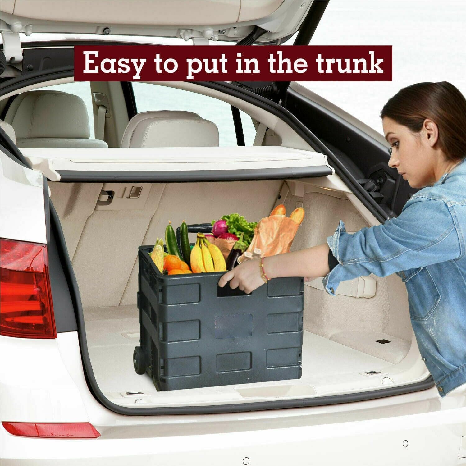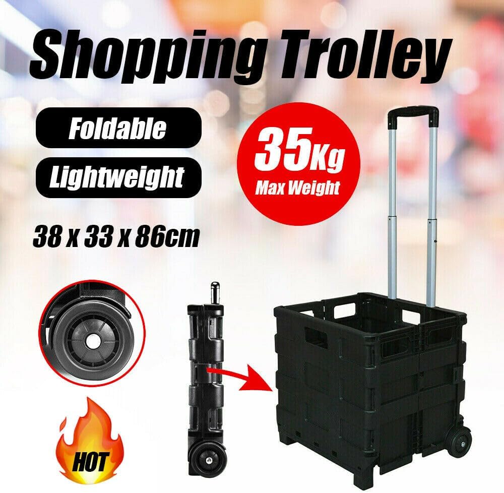 - Package Content - Folding Carry Cart with Lid I Color: Black I Material: PP I Dimension: 38x33X36cm I Weight capacity: 35KGS I Equipped with casters for easy and smooth transport I Use it as carry-on luggage or place it under your seat on your trips I rust proof extendable glide handle, allows for different heights.