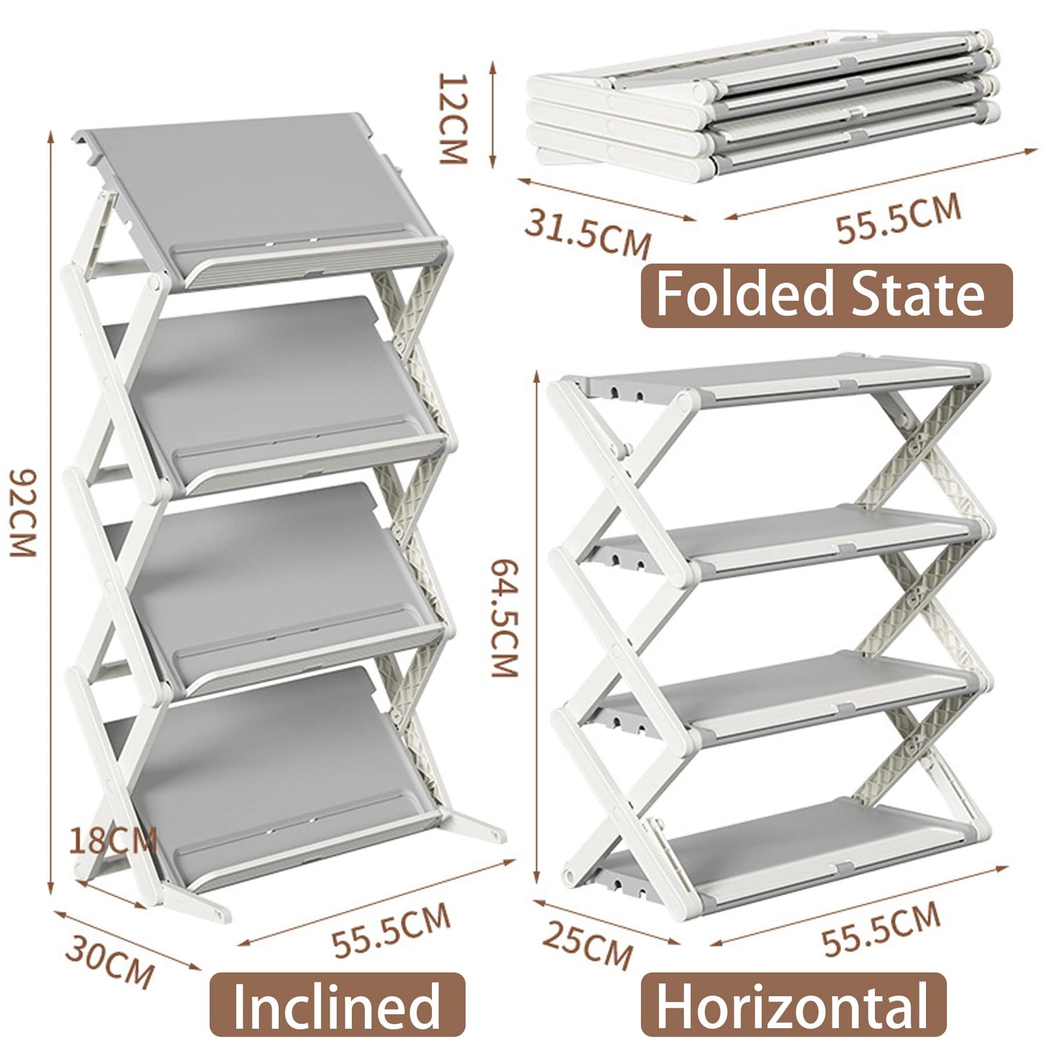 - FOLDABLE FREE STANDING SHOE RACKS: This 4-tier shoe rack can be placed flat or tilted, perfect for small spaces, The size of the horizontal plane is 55.5 x 25 x 64.5 cm, and the size of the inclined plane is 55.5 x 30 x 92 cm, folded size is 55.5 x 31.5 x 12 cm. It’s able to hold up to 10-12 pairs of shoes, making it a great tall shoe rack for closets, cabinets, wardrobes, entryways and bedrooms.