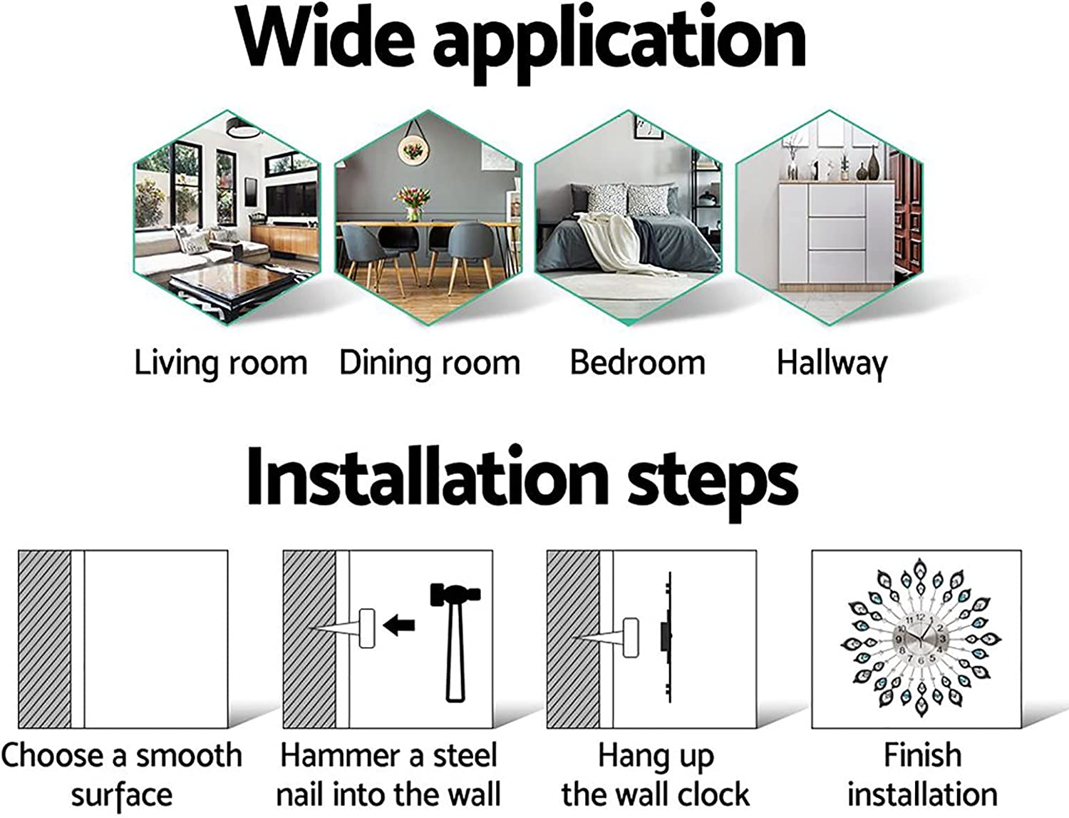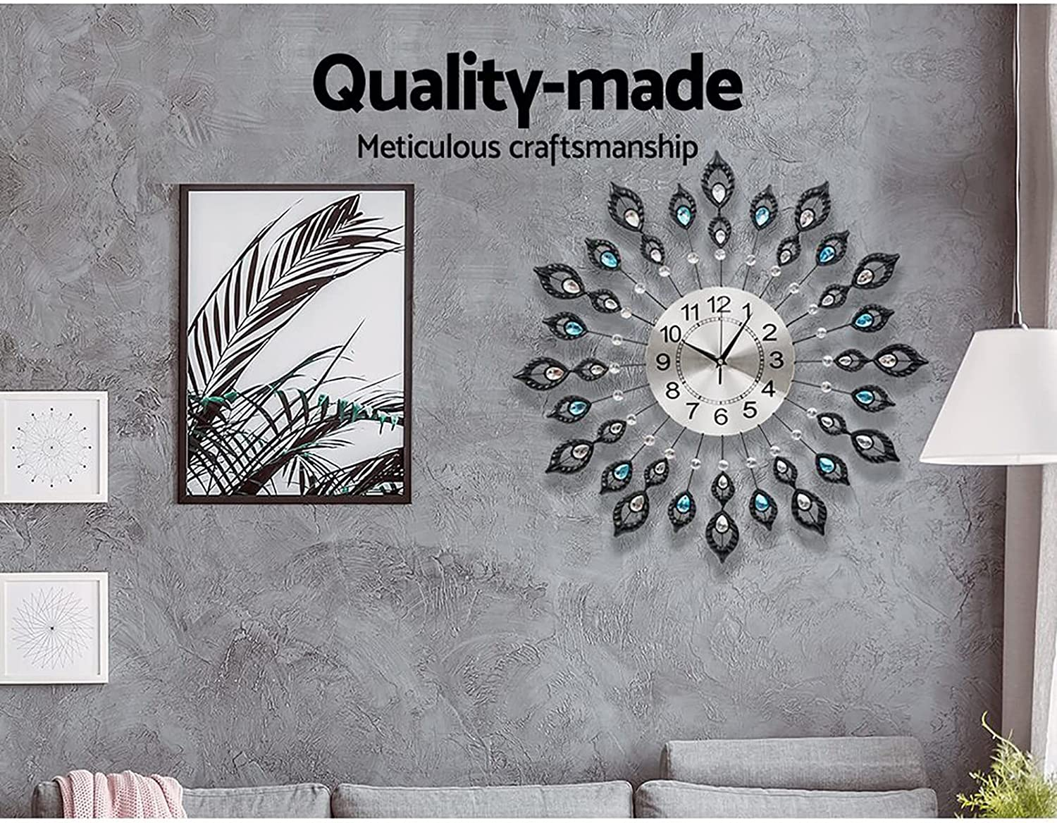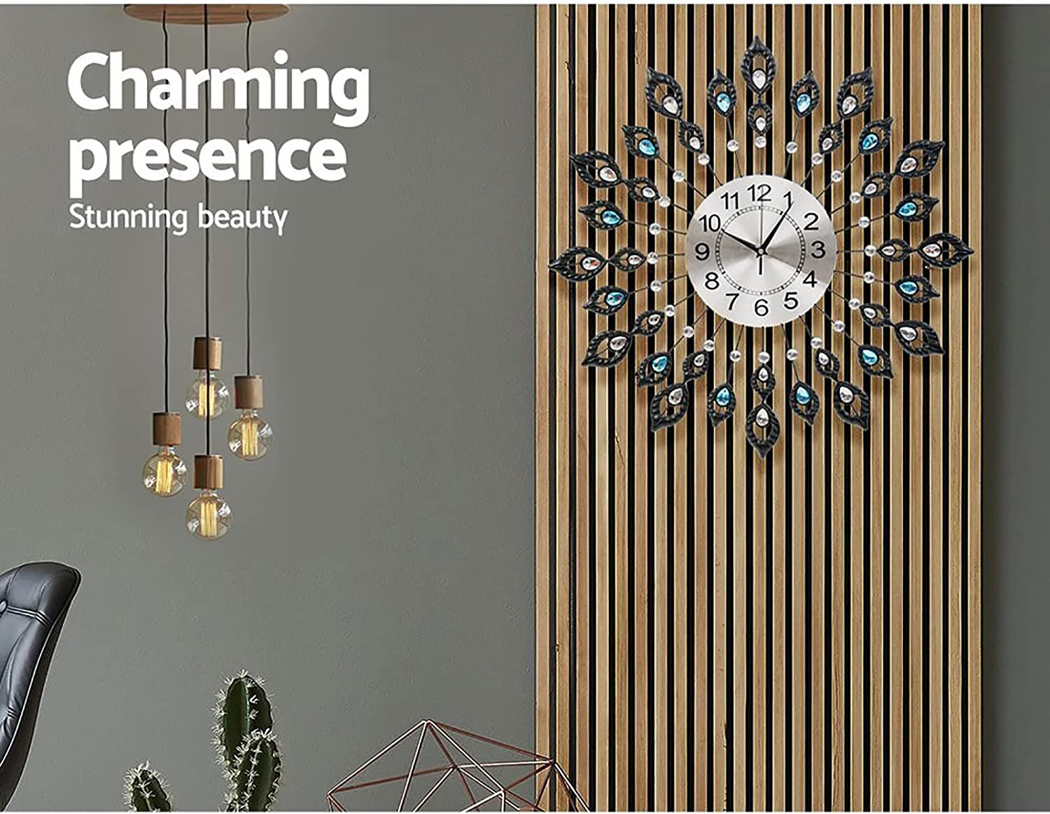 3D Modern Crystal Luxury Round Peacock Large Wall Clock is inspired by Northern European influences, its sophisticated design features large Arabic numerals, combining easy readability with exquisite aesthetics. Setting up this accurate time teller is a breeze, requiring just one AA battery (battery not included). Crafted from eco-friendly and non-toxic materials, including durable metal hands, this clock ensures long-lasting beauty. Whether in your living room, dining room, bedroom or office, our wall clock adds a touch of luxury to any space. Comes in black color with 80 cm diameter.