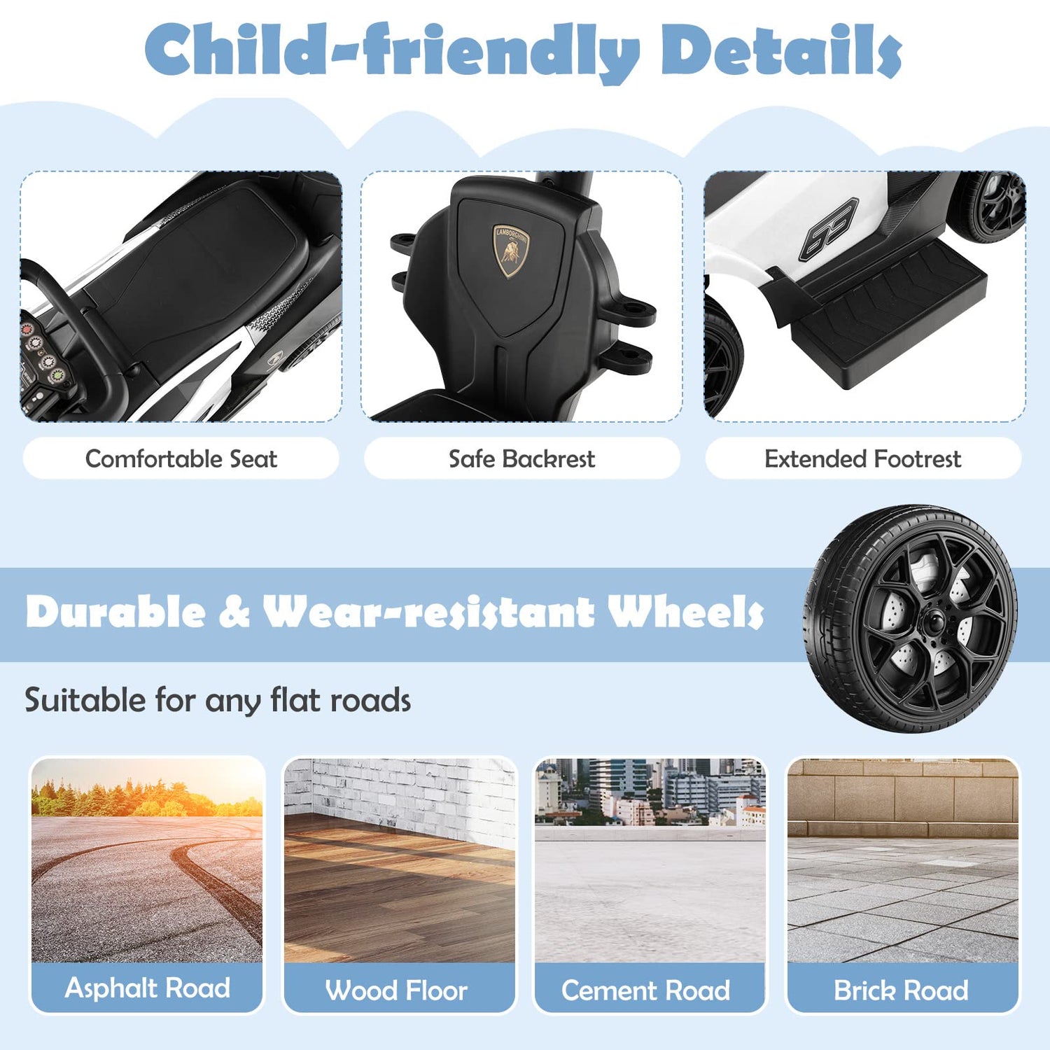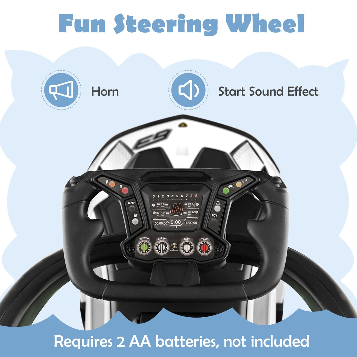 - Cool & Realistic Driving Experience: This Lamborghini officially licensed ride-on push car has a realistic appearance, vivid horn and engine sound, which will attract toddler's attention and add limitless fun to child's riding. Let it accompany your kids and create cherished childhood memories. Note: Two 1.5V AA batteries are required (not included).