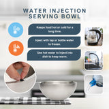 - WATER INJECTION SERVING BOWL - A non complicated solution to serving food fresher and at the desired temperature. This double wall stainless steel dip chiller bowl can be injected with water temperature of your choice, hot or cold. For keeping food cold, inject water from a tap or bottle and place it in the freezer. To keep food hot, inject boiling hot water from a kettle.