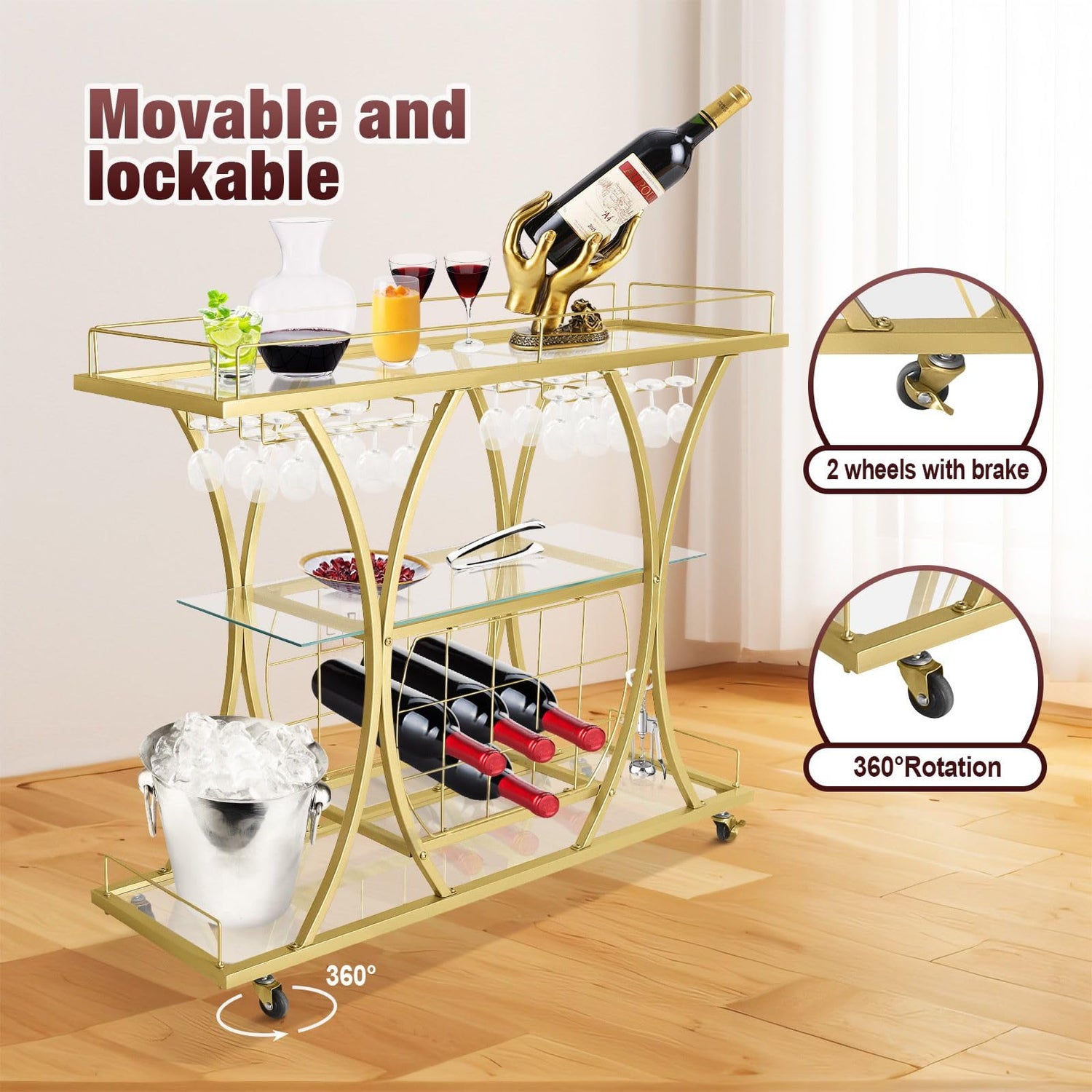 • Wheeled Bar Cart: This modern bar cart is equipped 4 smooth 360-degree swivel wheels, making it easy to roll wherever you go. 2 wheels with brakes make the cart safe.