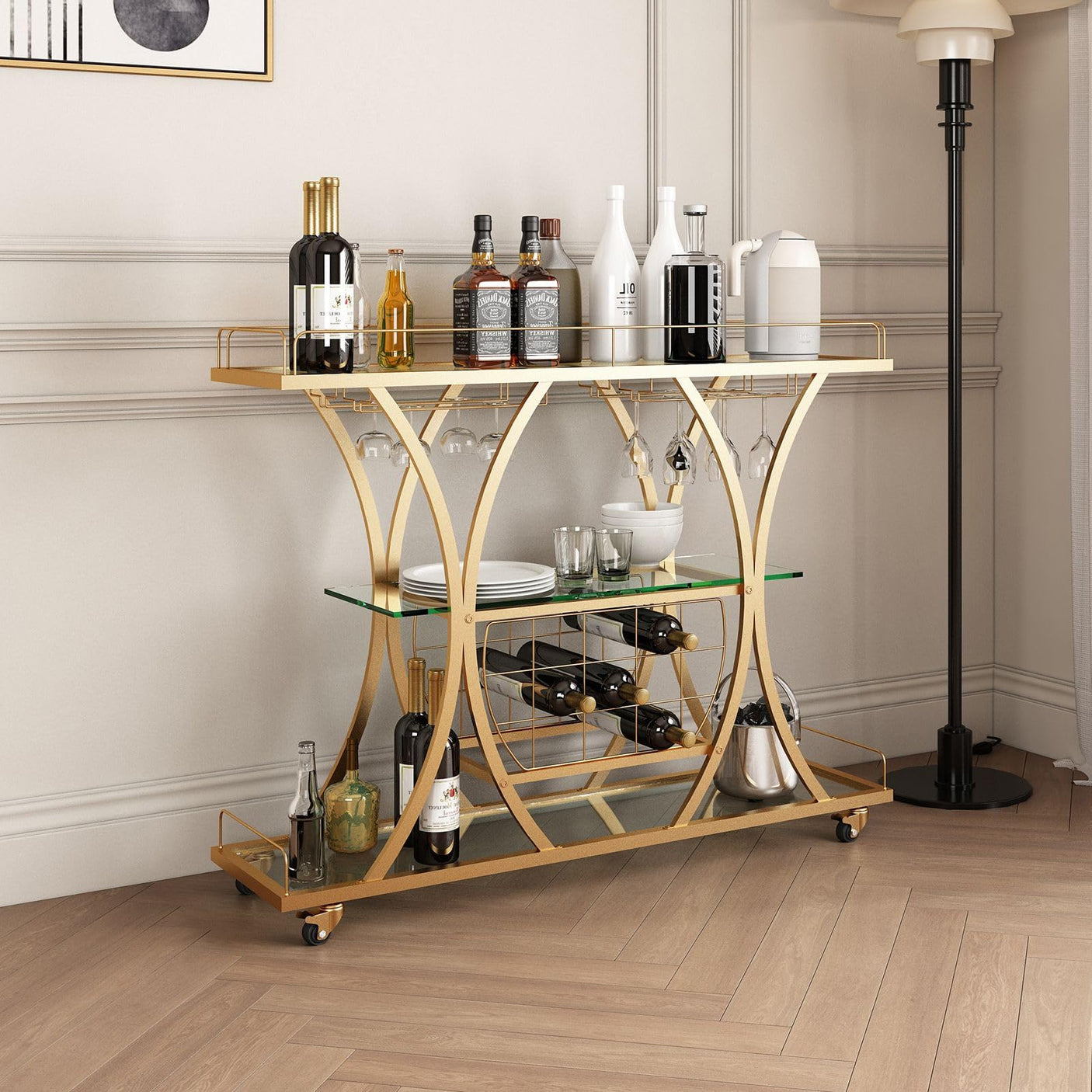 • Large Storage Capacity: Designed with 3 tiers of open spacious tempered glass shelves to store and display all your bar essentials and accent pieces. The middle shelf also comes with 4 stemware holders and a wine rack to show off your favorite vintages and glasses, it holds 12 wine glasses and 9 bottles of wine easily.