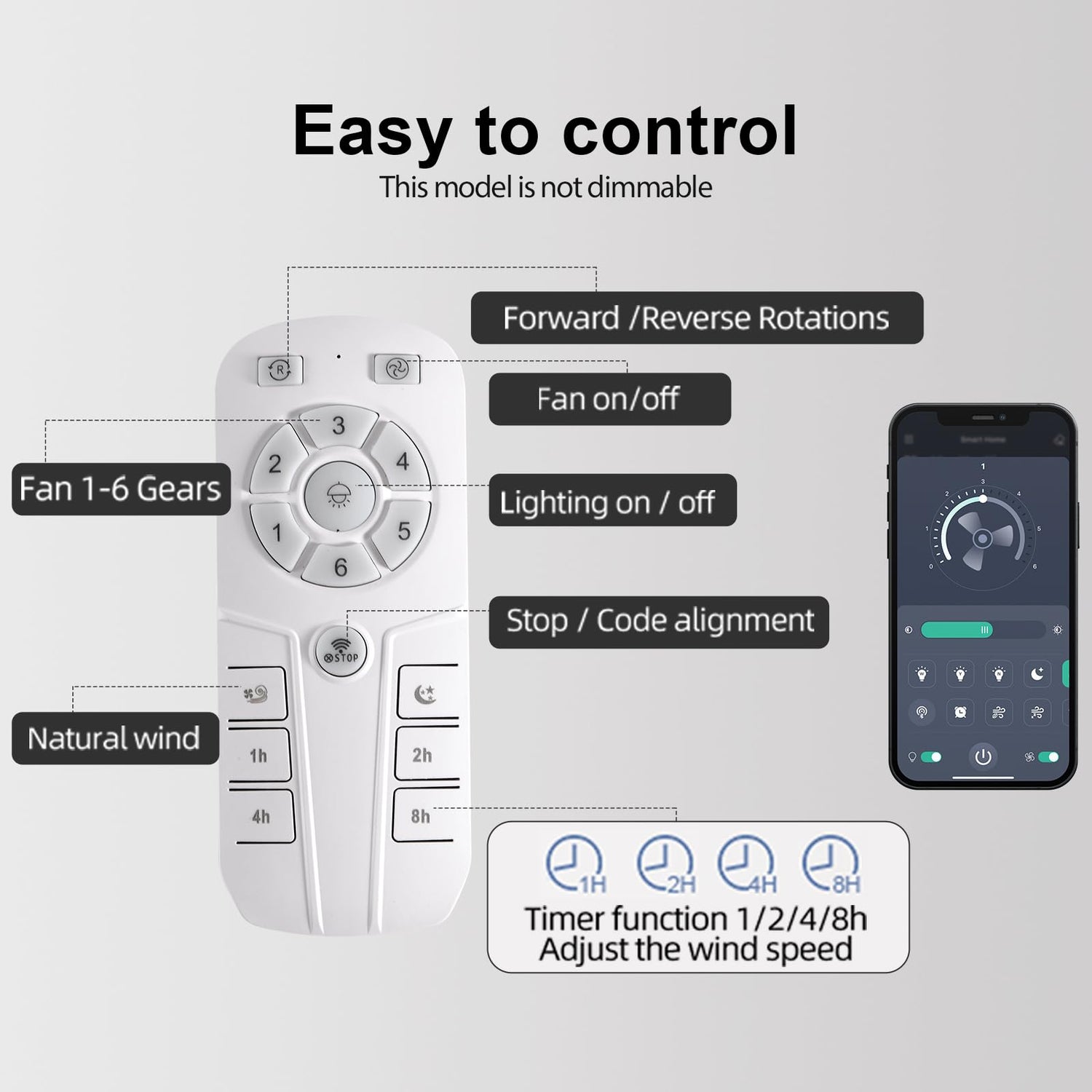 • Various Functions Ceiling Fan -- The chandelier ceiling fan with light is featured with 6 wind speed levels, 1/2/4/8H time settings, you can adjust wind speed by remote &APP control.Reversible motor capable of forward and reverse rotation. Fan or lighting can be turned on separately. Note: Remote &APP cannot achieve infinite dimming.