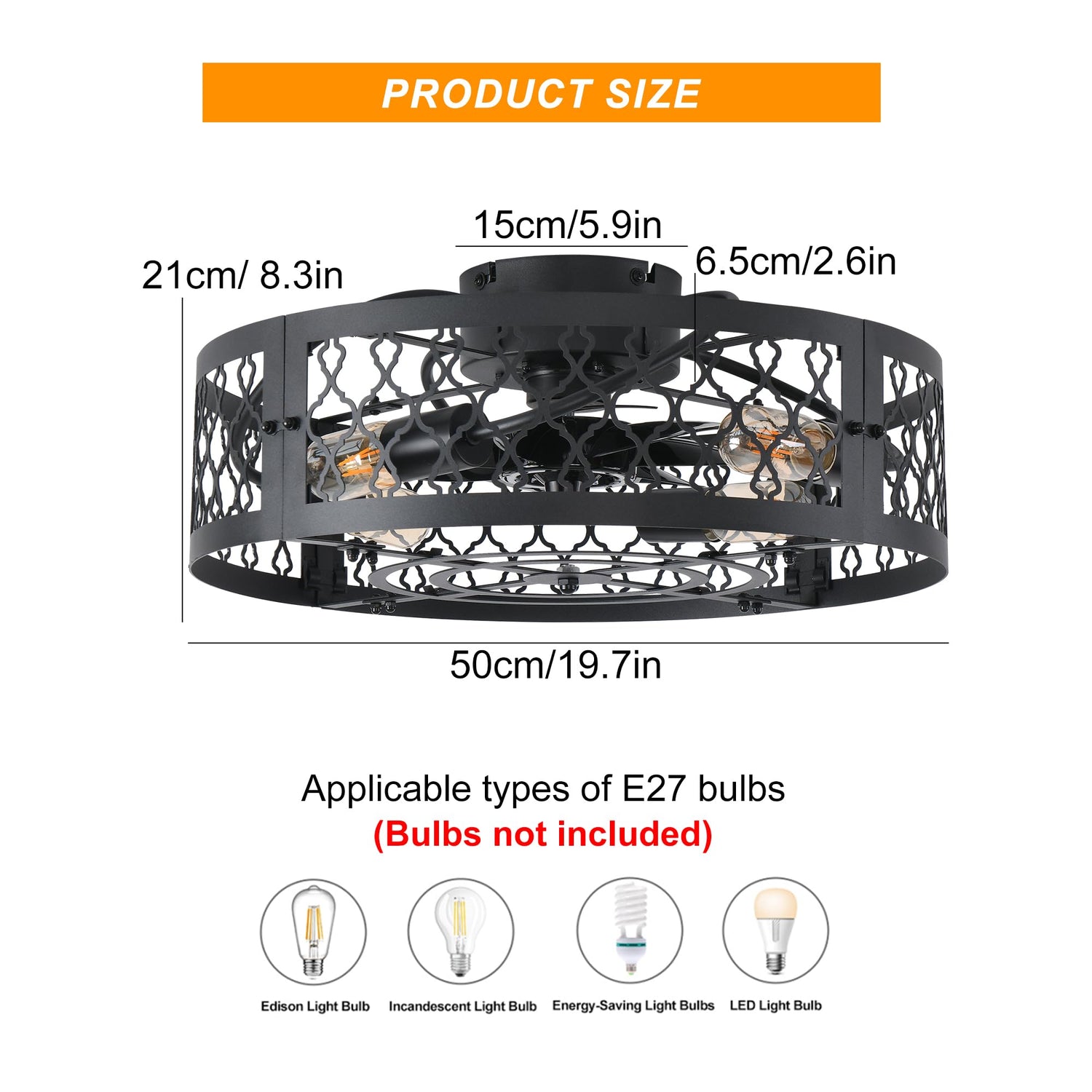 • Ceiling Fan Lights Specification -- The cage ceiling fan with light Dia:20in/51cm, height 8.26in/21cm. Ceiling canopy Dia 5.9in/15cm, height 2.56in/6.5cm. It requires 4x E27 base bulbs(Not included) and MAX 60W.This vintage ceiling fan has a stylish and versatile look with quality and texture. Farmhouse and modern style can be switched at will. Suitable for bedrooms, kitchen and so on, add style and function to your space, upgrade your home decor.