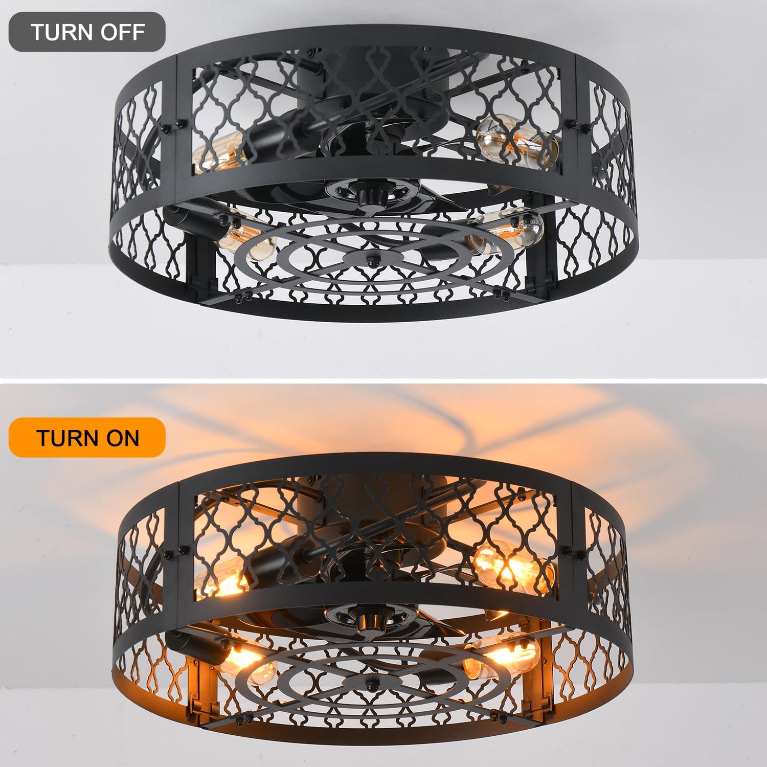 20in Caged Ceiling Fan with Light,Bladeless Black Fandelier Ceiling Fan with Remote,Industrial Farmhouse Flush Mount Ceiling Fan Light Fixtures for Kitchen,Bedroom, Living Room