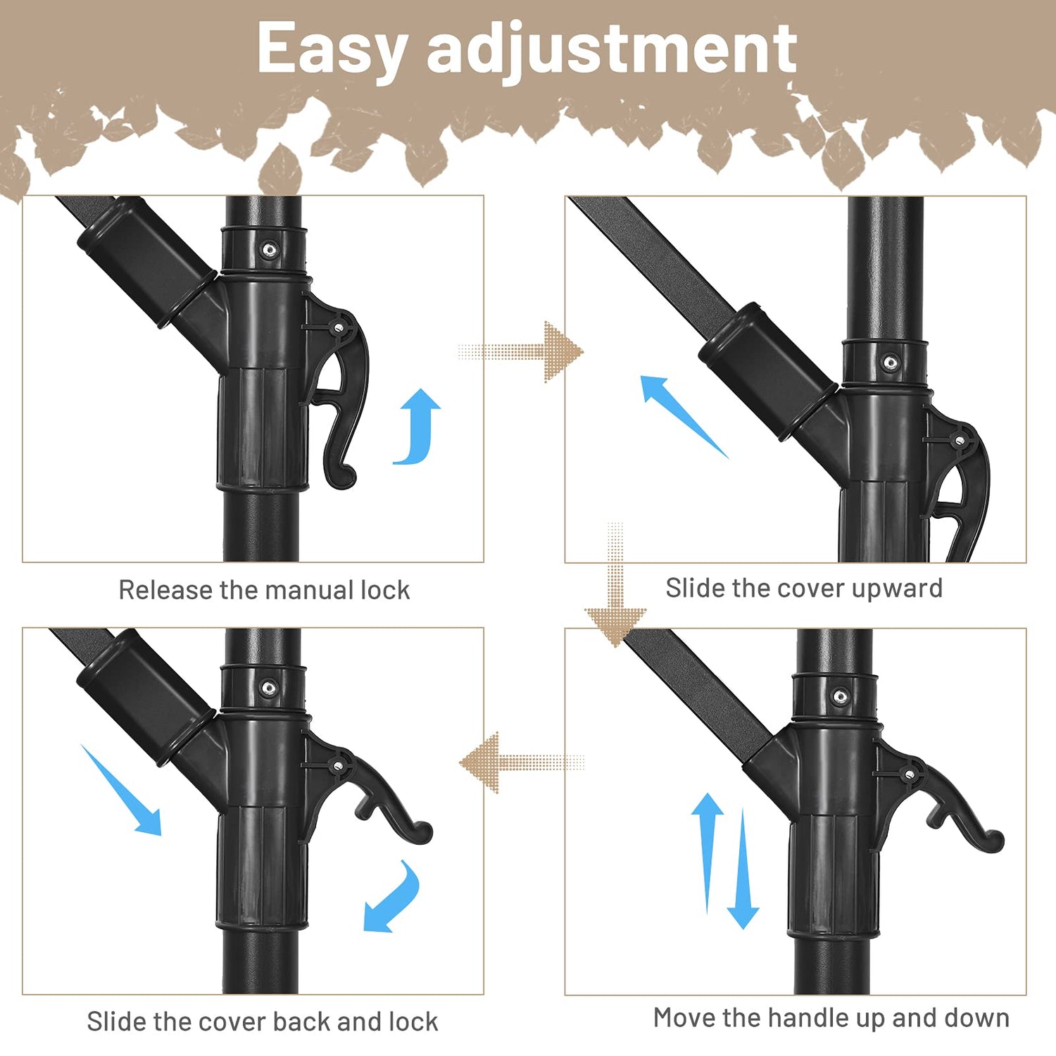 - Easy Operation & Multi-angle Adjustment: There are several additional settings designed for your convenience. Coming with a crank, you can effortlessly and easily open or close the patio offset umbrella canopy. Besides, there is a flexible cantilever tilt which allows you to adjust the canopy for more angles shade.