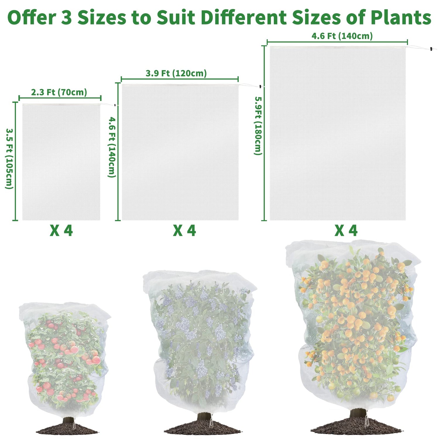 - Plant Netting Mesh Set : No-need to bag each fruit, These plant protection nets measure 3.5 Ft Tall x 2.3 Ft Wide and large enough to be placed over the plant in its entirety. We provide a variety of mesh bags in different sizes for different types of plants