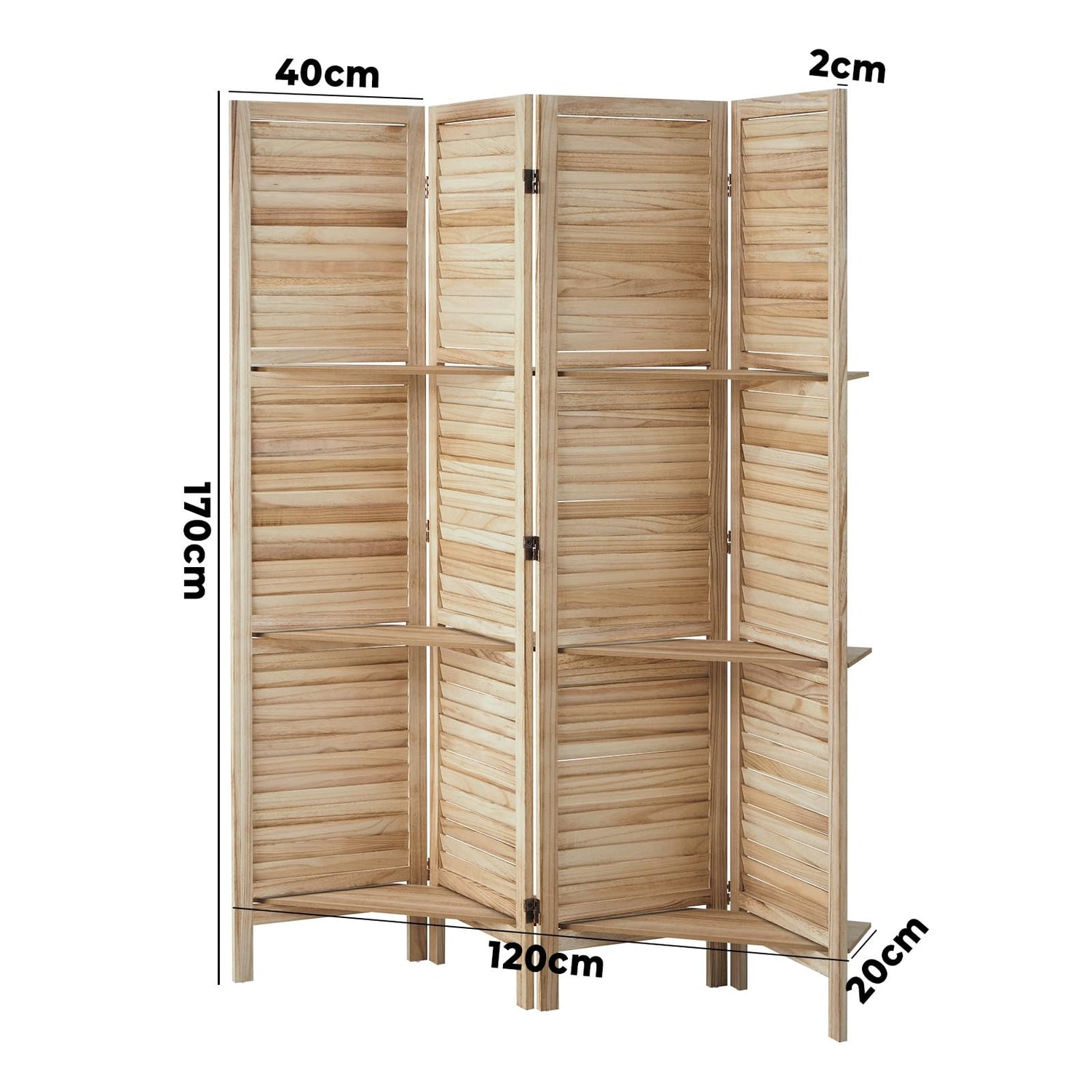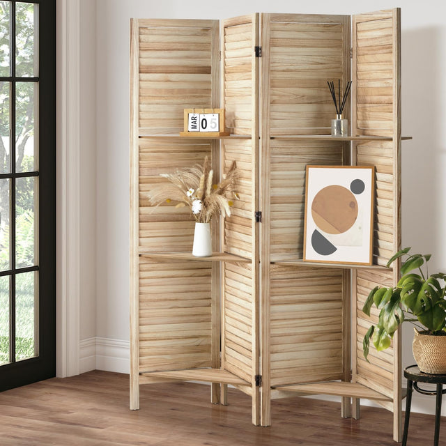 Room Pivider 4 Panel Privacy Portable Screen with Display Shelves Natural Wood