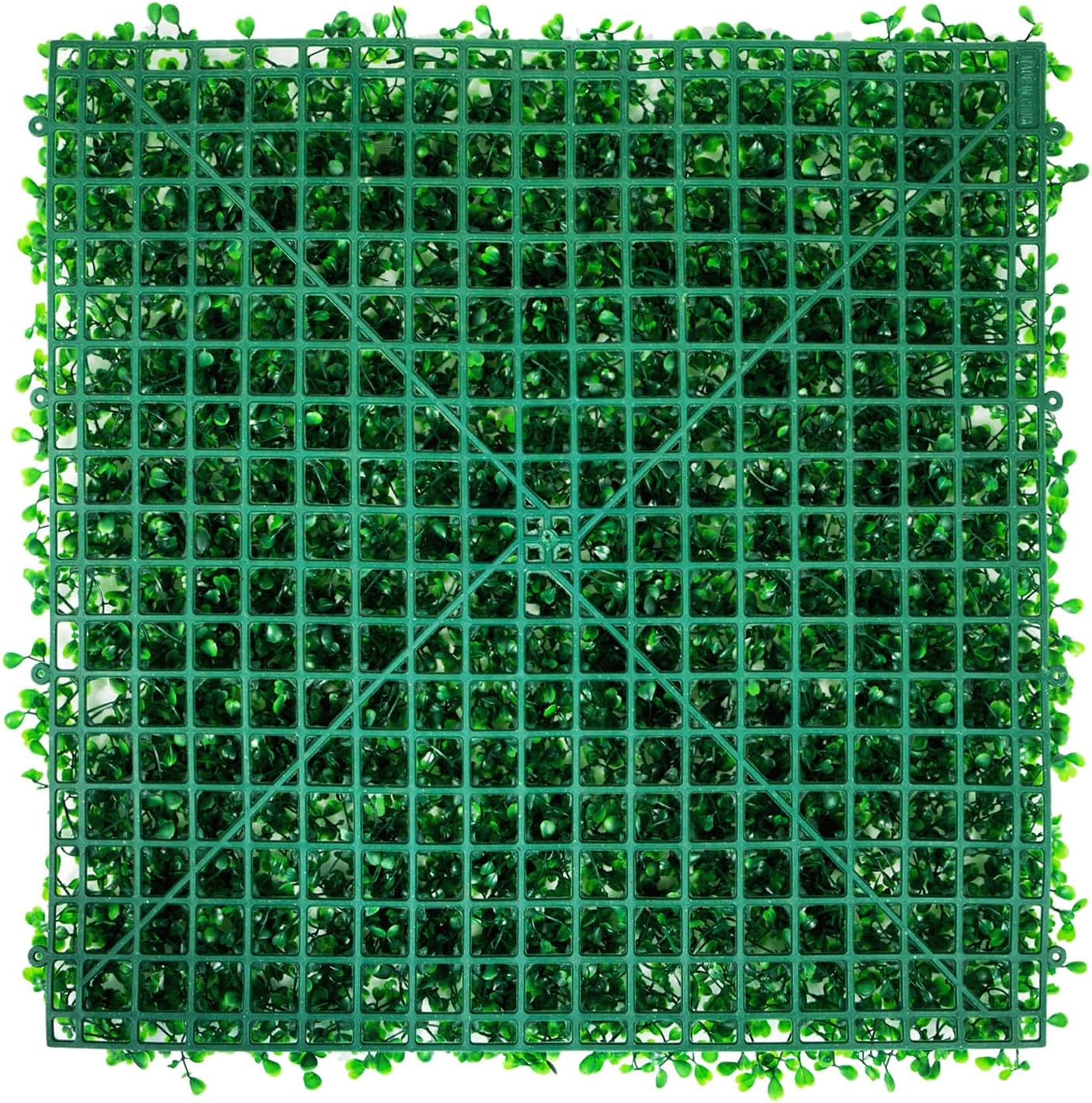 - Premium PE Material: With SGS certification. Size: 10'' x 10". Quantity: 12 pcs. The polyethylene material is environmentally friendly and sun-proof, which can prevent the leaves from fading quickly. The artificial hedge panel will keep your fences or walls always looking good.