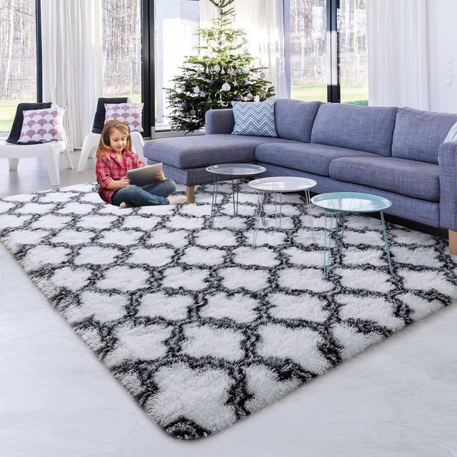 LLarge Area Rugs for Living Room, Ultra Soft Indoor Modern Fluffy Bedroom Carpets, Washable Furry Throw Rugs Area Carpets for Children Bedroom Home Decor Nursery Rug (White/Black, 200 x 300 CM)
