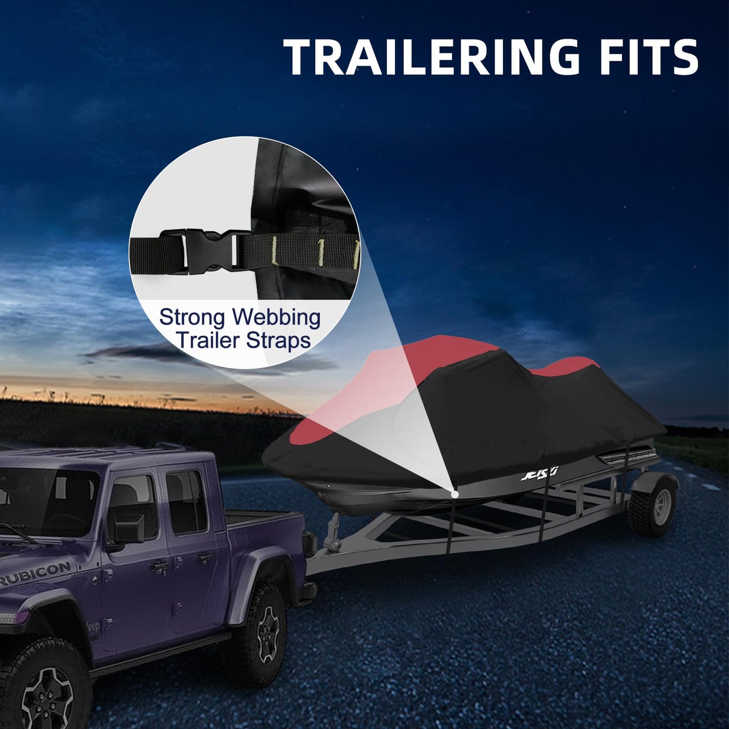 - Trailering Windproof PWC Cover: Seadoo windproof cover can be used for trailers. The Seadoo cover has an adjustable elastic cord around the bottom ensuring a tight fit. Built-in quick-release strap buckles for quick adjusting. PWC cover has windproof straps to around the jet ski cover can be adjusted according to your needs to perfectly fit your seadoo for better protection against strong winds. Don't worry about your watercraft cover being blown away in the strong wind.