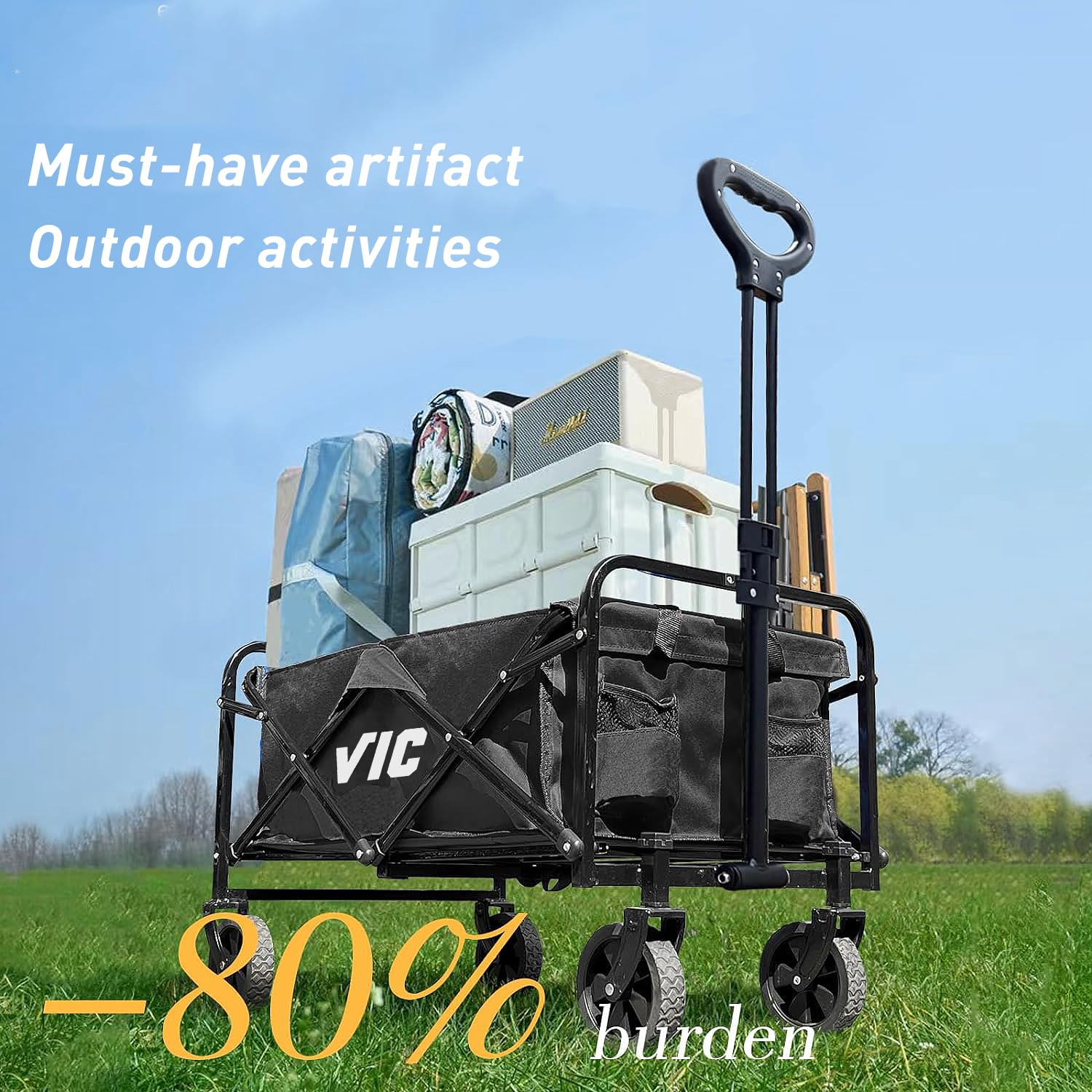 - START YOUR WONDERFUL TRIP: It can sound exhausting when you consider all the gear you're carrying at the beach or outdoors. Don't worry, the VIC folding wagon cart will help ease your burden, it could help you shift all of the cargo out of your arms and onto a sturdy wagon and make it so much easier on yourself. It's an excellent option for outdoors and it can also be used to carry groceries, fishing, athletic equipment or your camping gear.