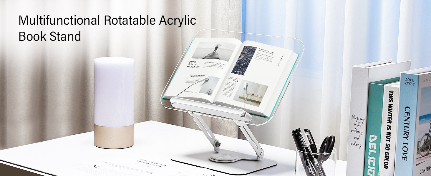Book Stand for Reading, Adjustable Book Holder with 360° Swivel Base Foldable Stand Recipe Book Holder with Elastic Page Clips