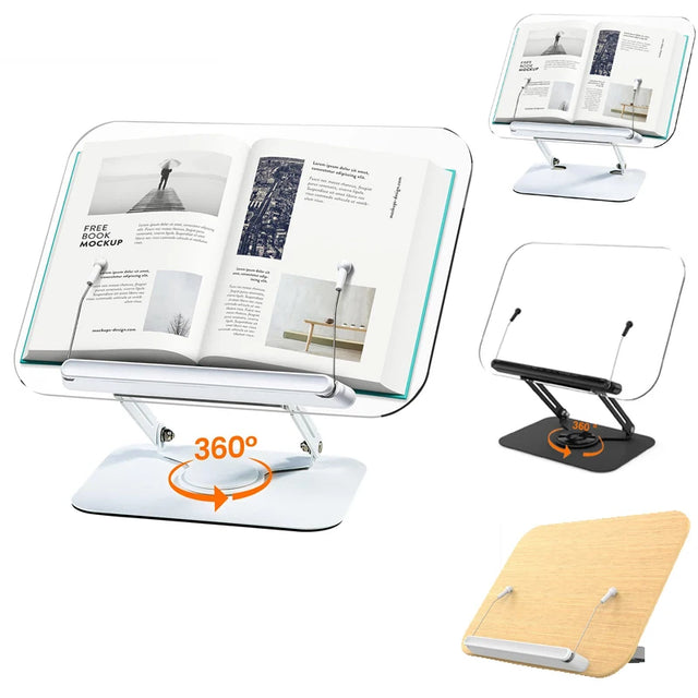Make reading, studying, or cooking easier with the Adjustable Book Stand for Reading. Featuring a 360° swivel base, height and angle adjustability, and elastic page clips, this versatile stand is perfect for books, tablets, recipes, or even laptops. A must-have tool for classrooms, kitchens, libraries, and offices.
