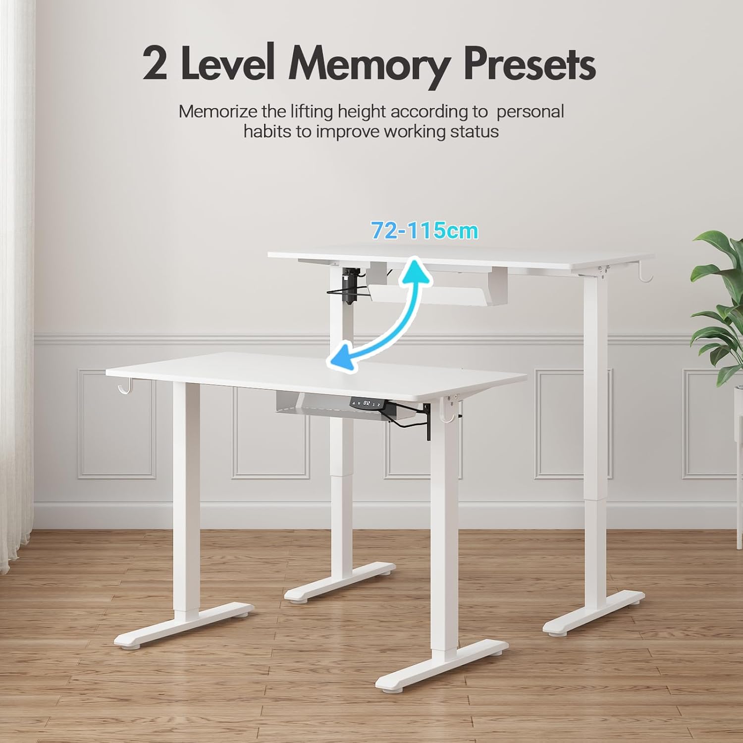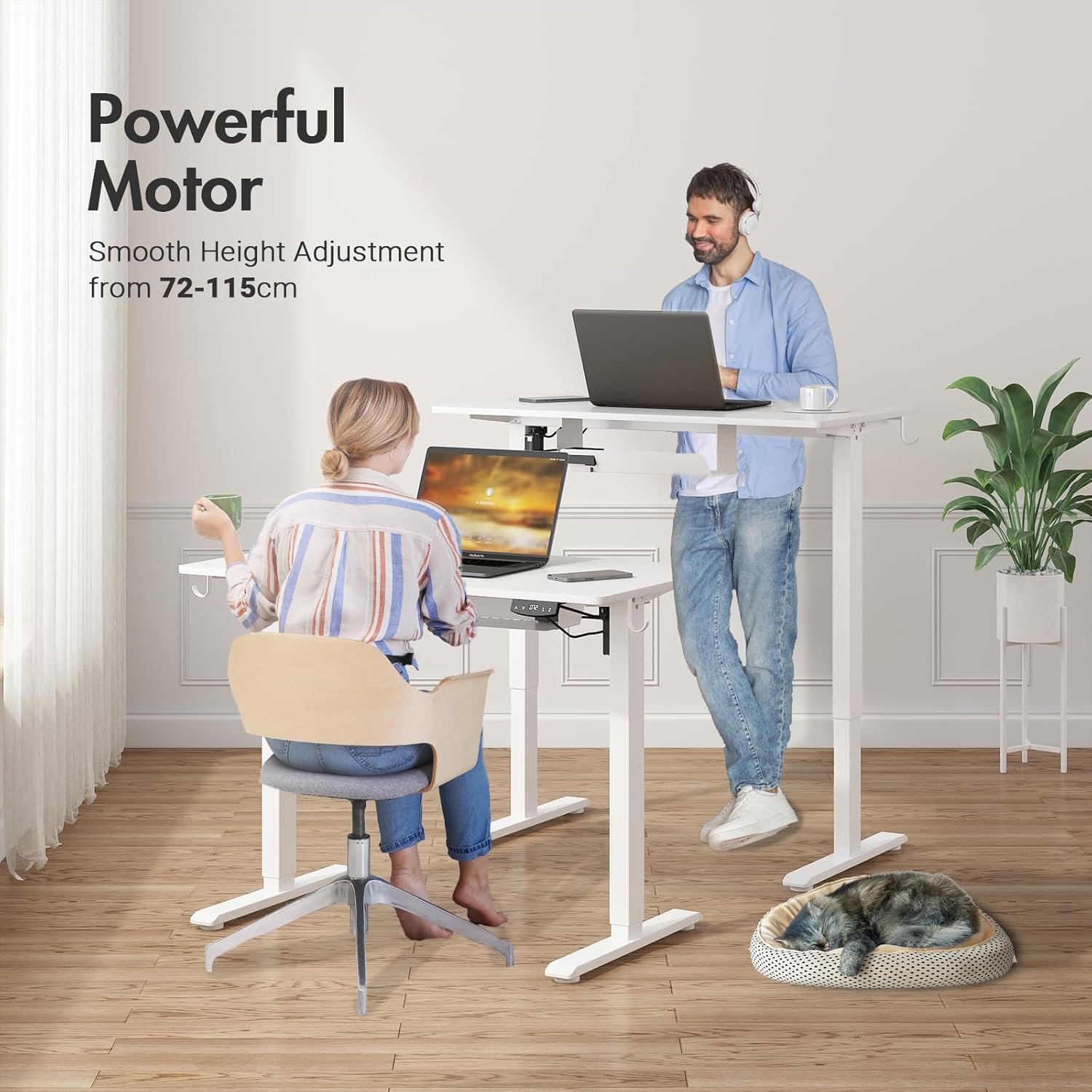 Electric Standing Desk, Height Adjustable Ergonomic Sit Stand Desks with Hanging Hooks and Cable Management, 100 x 55 cm Whole Piece Desktop, for Small Space, White Frame + White Desktop